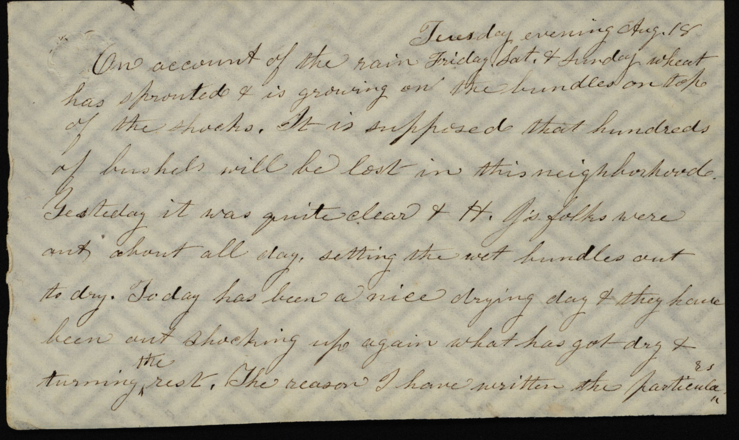 - Letters from Sarah Underwood to Ann E. Tefft, August 16, 1857 and August 18, 1857 describing the pumpkin pies she has baked, how the weather has damaged the wheat crop, and encouraging her family to visit.