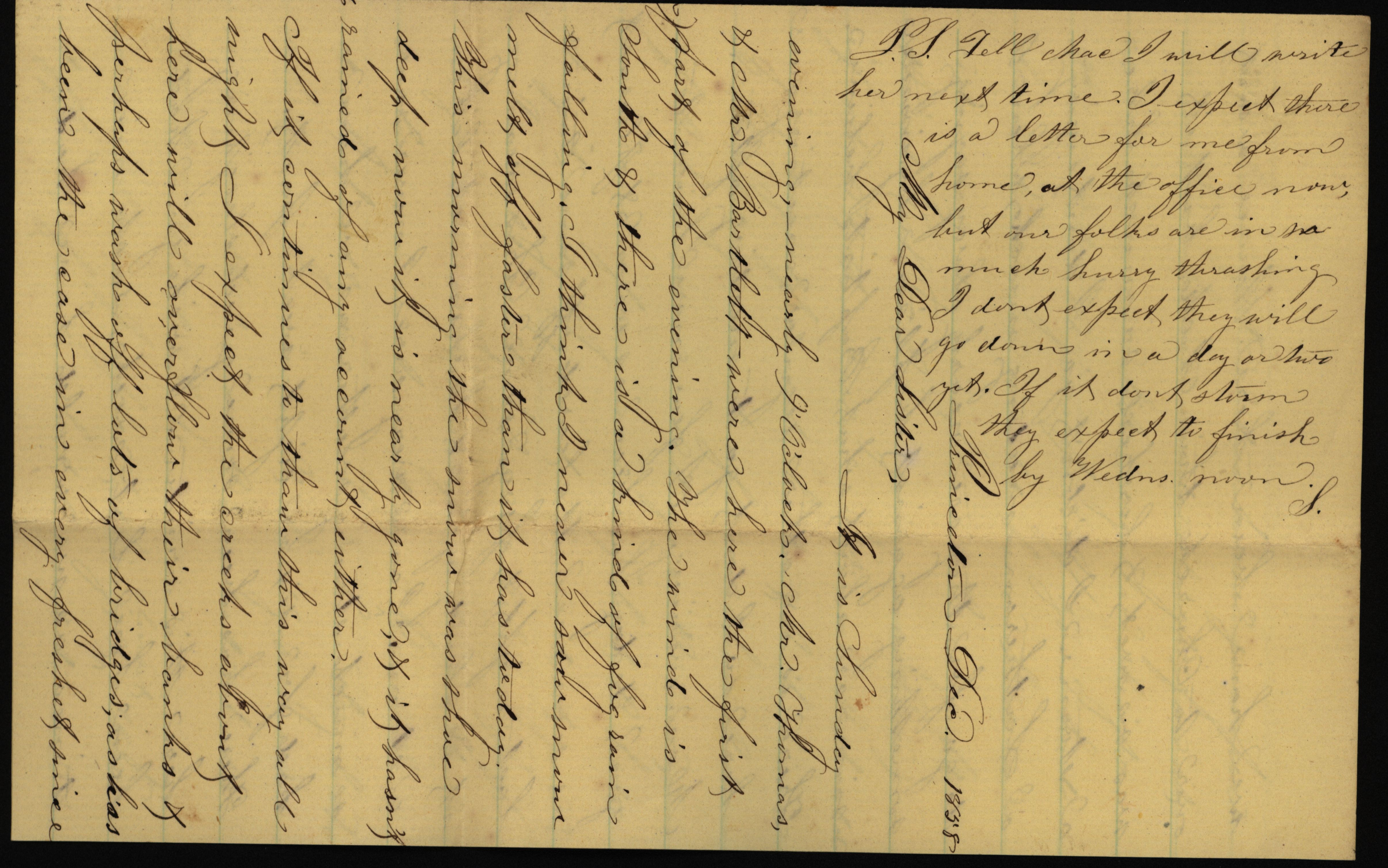 - Letters from Sarah Underwood to Ann E. Tefft, Mae Tefft and John Tefft November 30, 1858 and December 1858 describing their Thanksgiving celebration, financial difficulty that prevents travel, snow, the potential for flooding, Lutheran church meetings, sleighing, dreaming, and letters from family.
