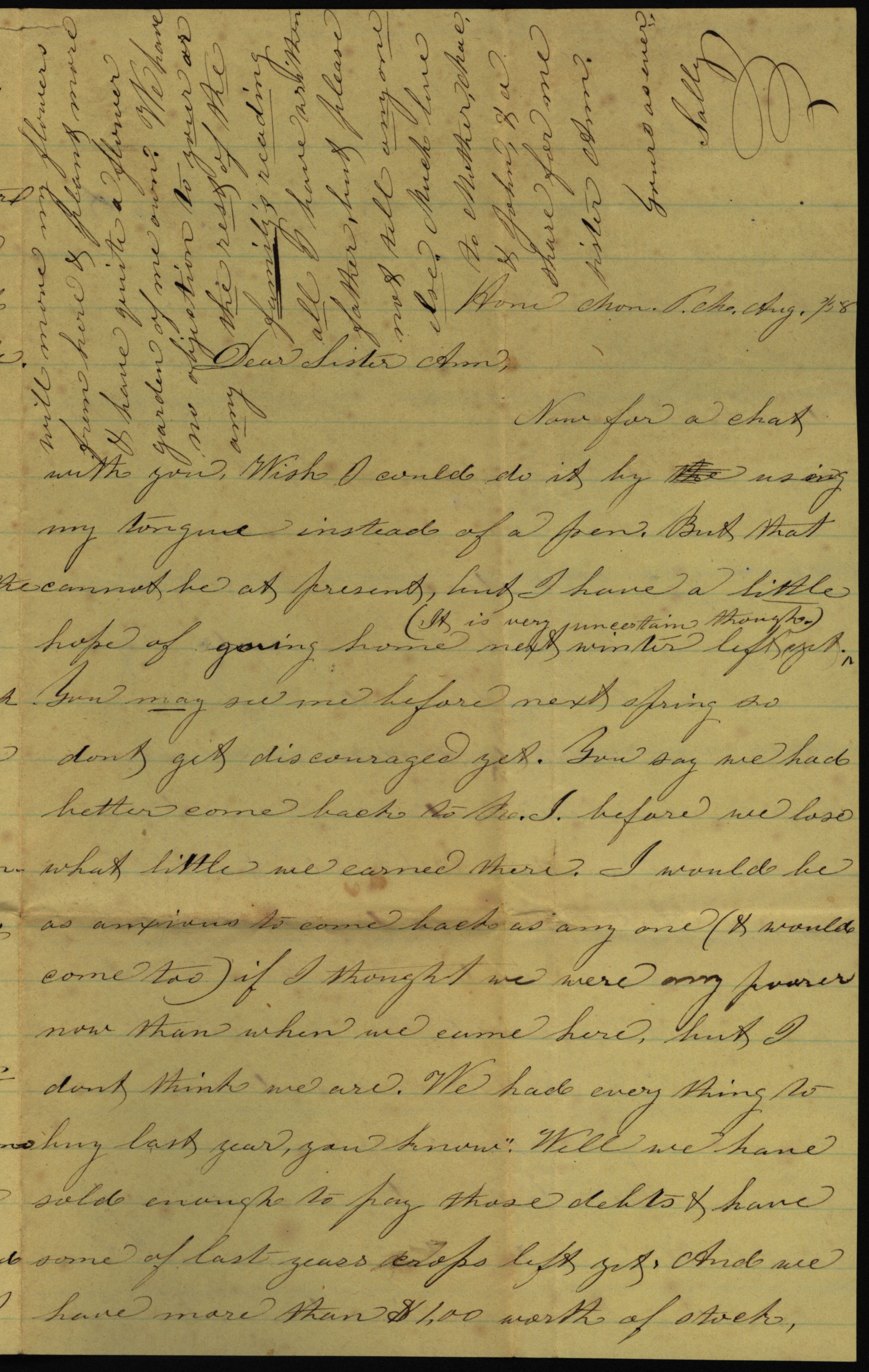 - "Letter from Sally to "Dear Sister Ann," August 1858", Sarah Underwood Papers, Iowa State University Library Digital Collections