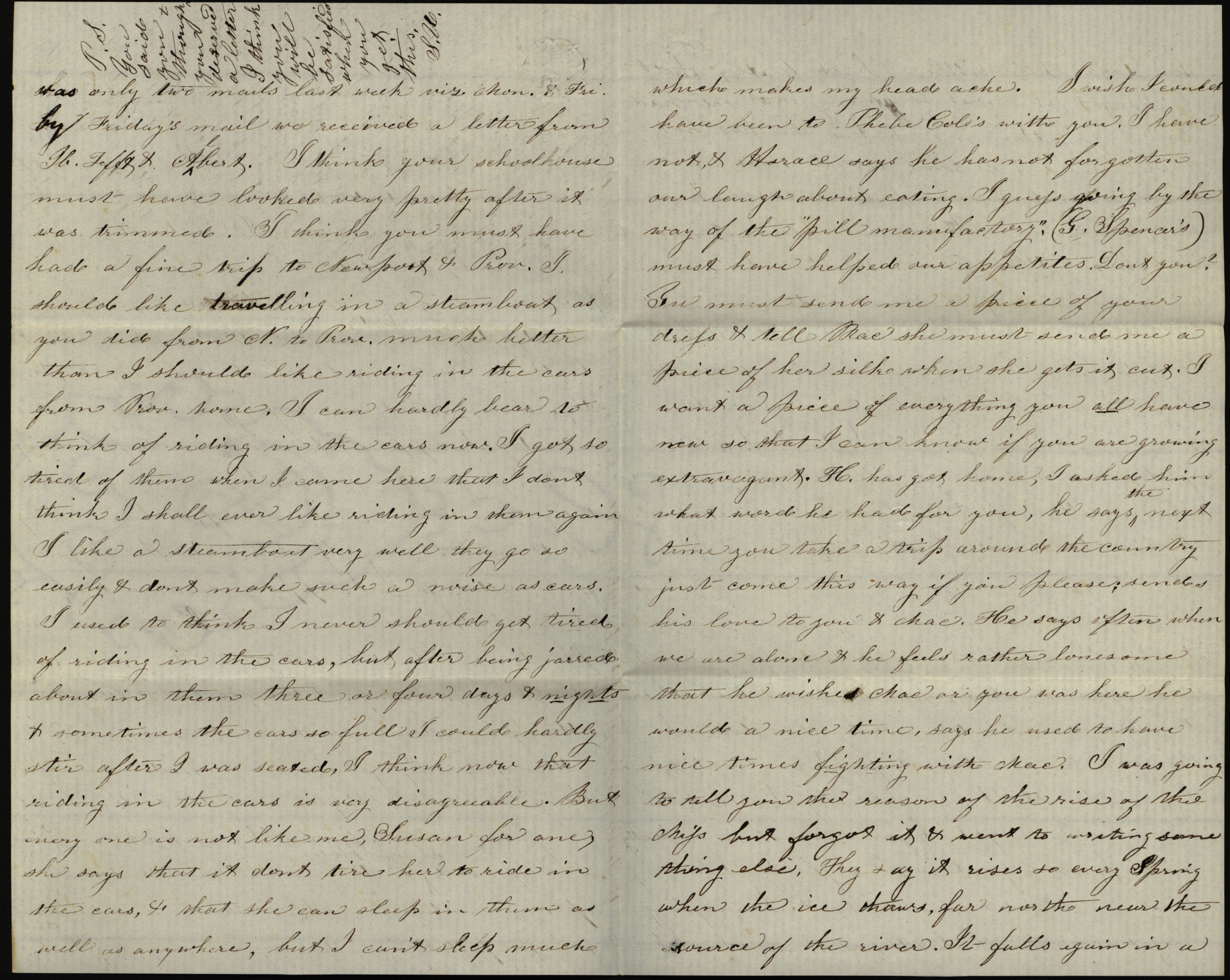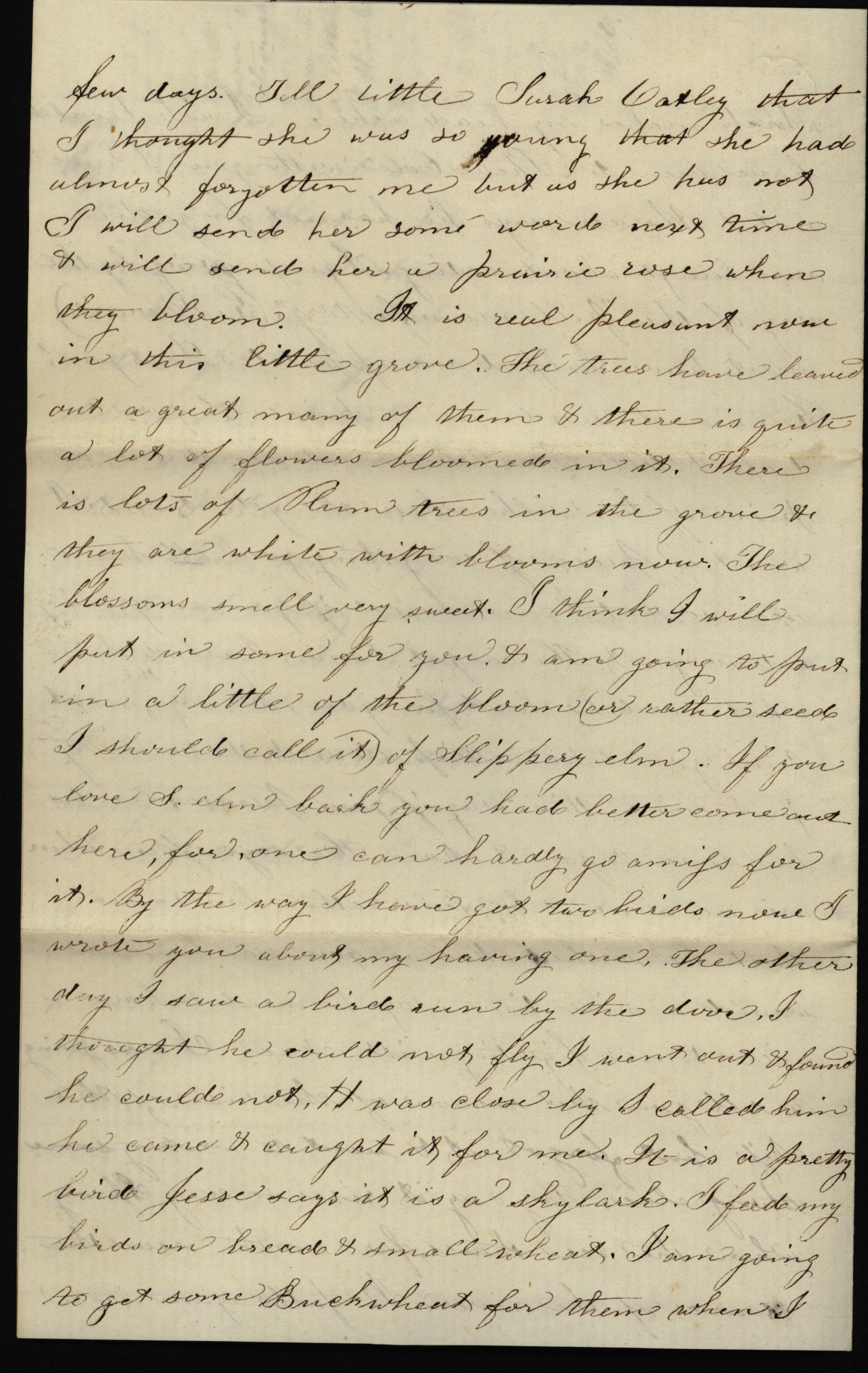 - Letter from Sarah Underwood to her sister Ann E. Tefft, May 24 in which she compares steamboat and carriage travel, describes the plum trees in her yard, recounts catching a lark, and requests samples of fabric from her sisters' clothing.