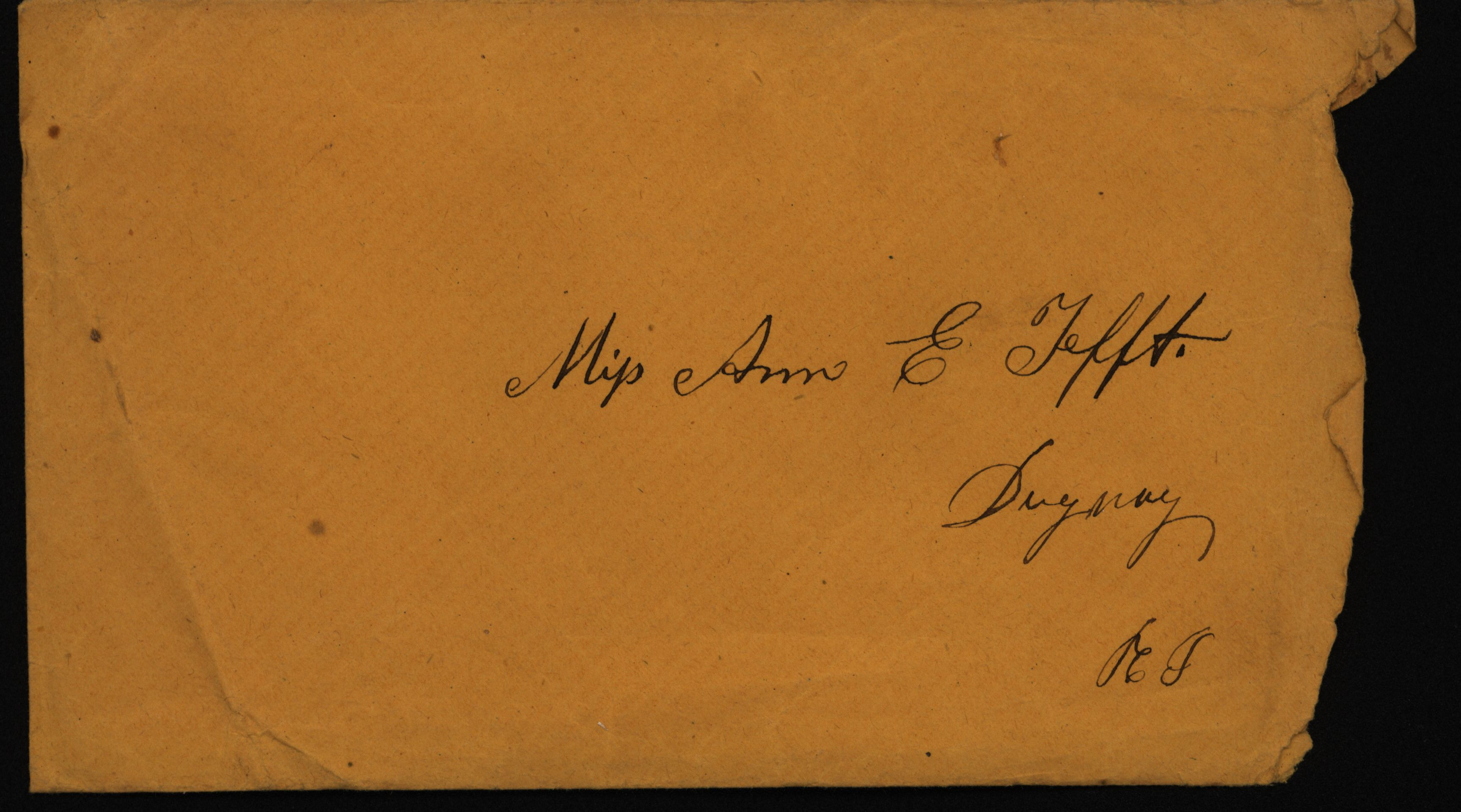 - Letter from Sarah Underwood to her sister Ann E. Tefft and "Sister Mercy," December 27, 1857 describing the winter weather, Christmas dinner, Sarah's sense of isolation, an attempt at matchmaking, spinning, and news of friends and family. A verse is written on the envelope.