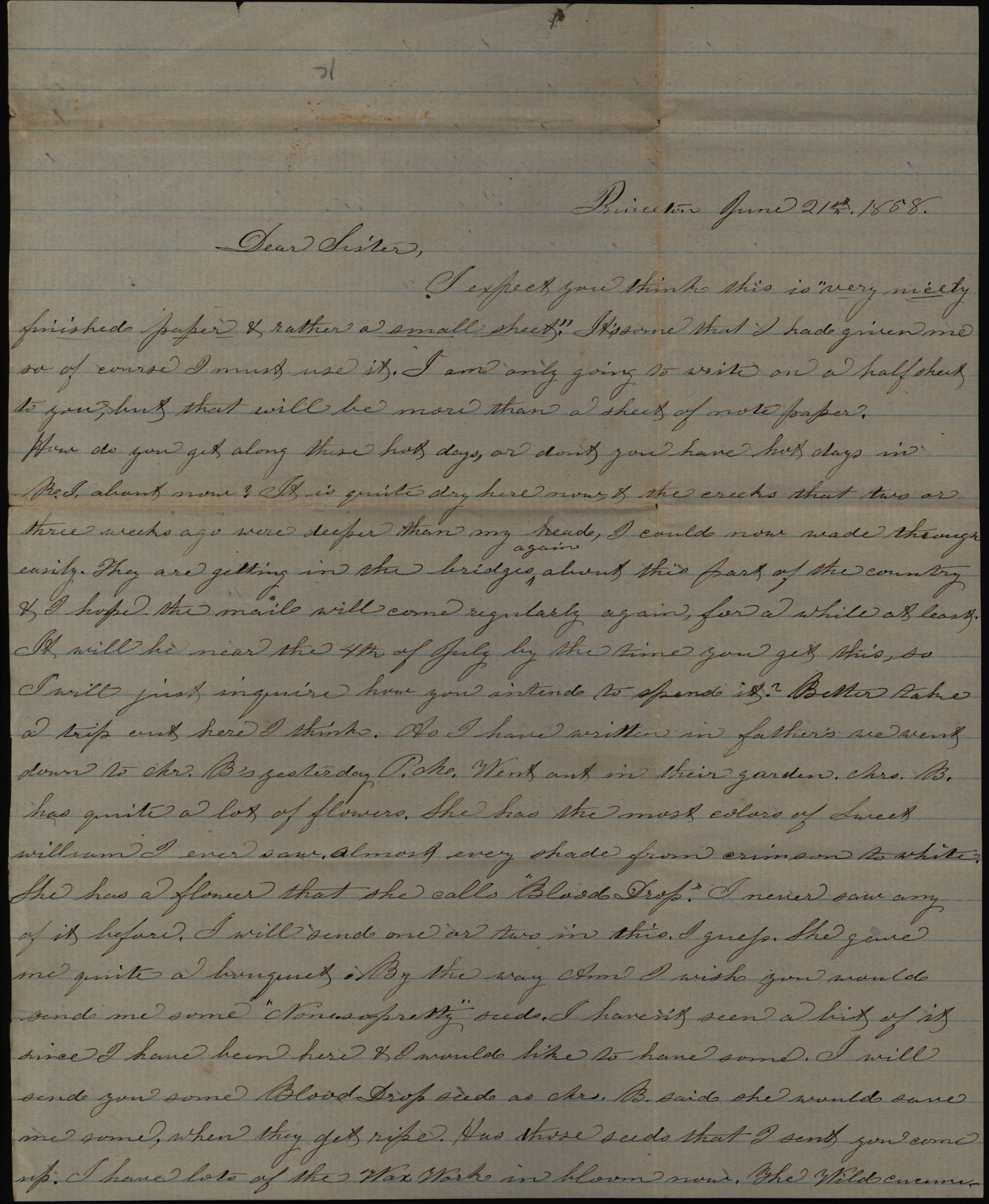 - Letter from Sarah Underwood to Nancy Till and Mae Tefft, June 21, 1858 describing a neighbor's flower garden and and requesting news of friends and family.