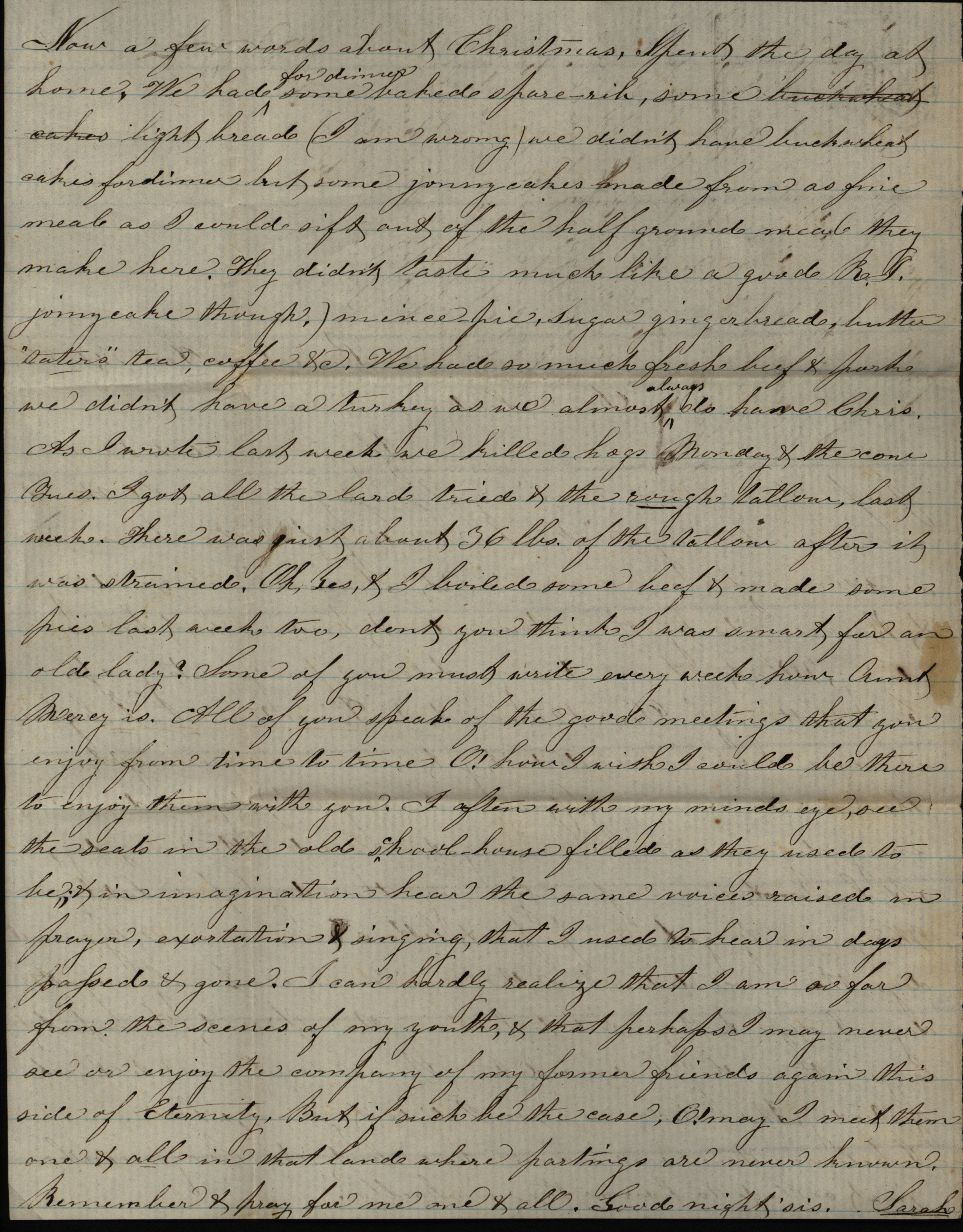 - Letter from Sarah Underwood to her sister Ann E. Tefft, December 27, 1858, describing tallow making, preparation for Christmas, the Christmas meal, and missing her family.