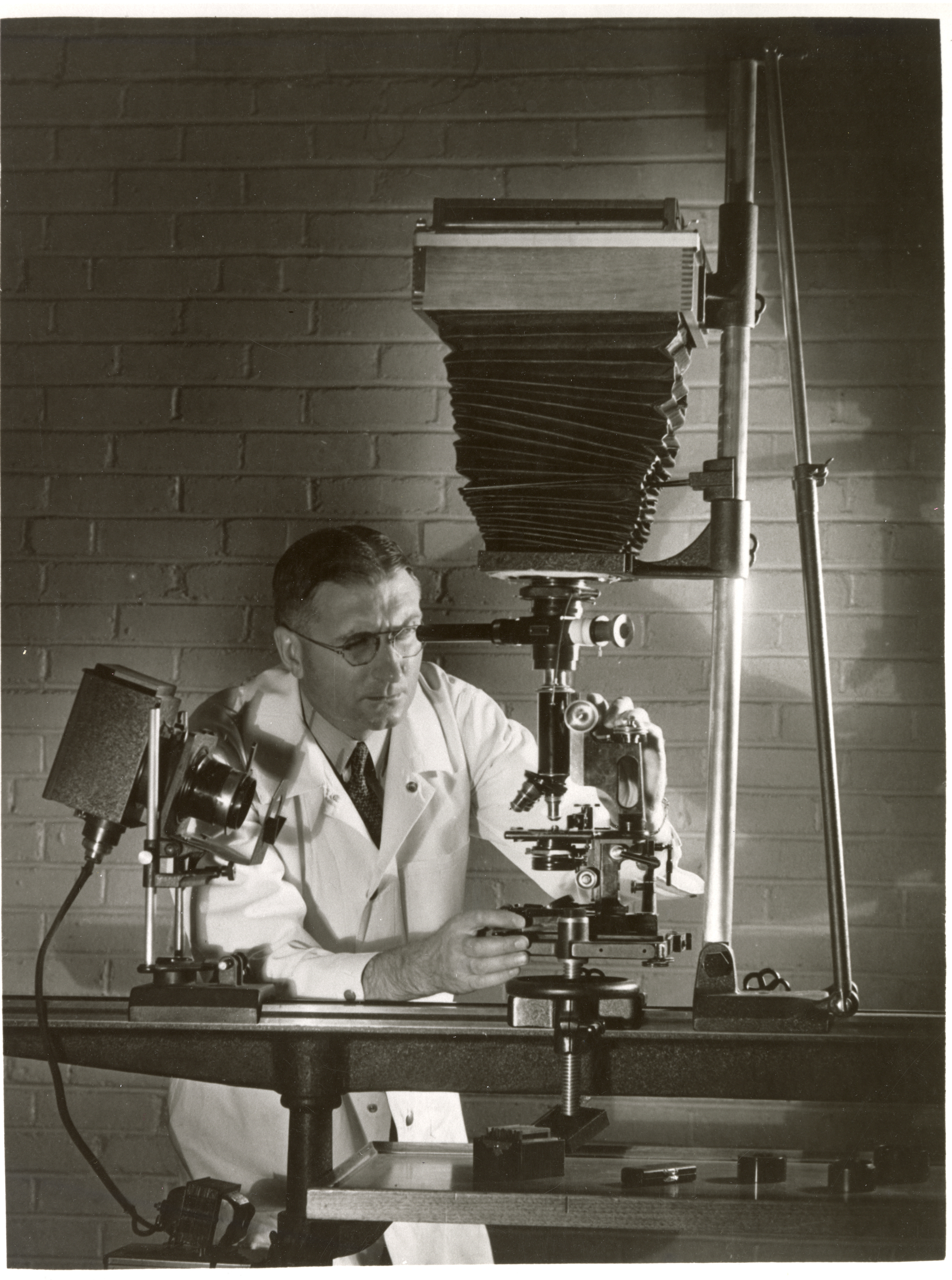 - Photograph of Harry Biester of the ISC Veterinary Medical Research Institute preparing to take a photograph in 1936