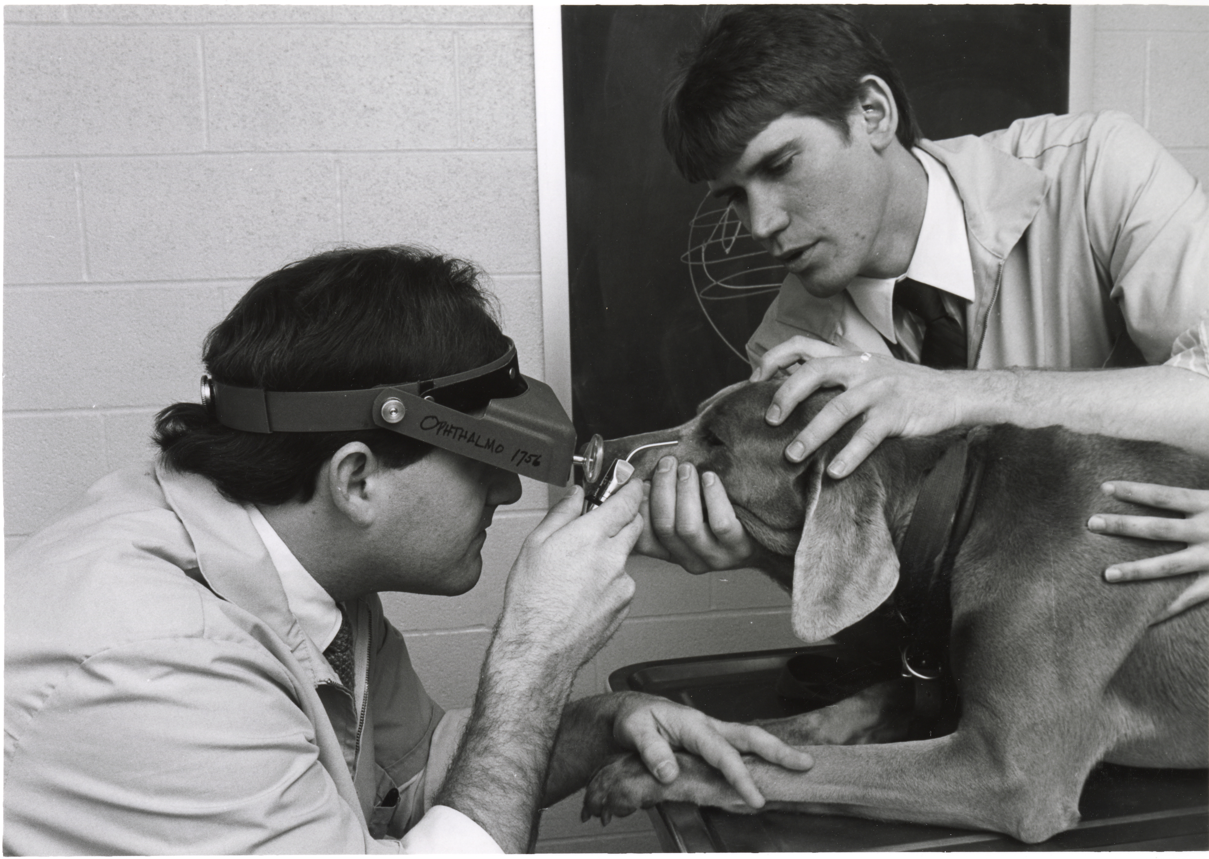 - "Photograph of veterinary clinicians performing and eye exam on a dog", Iowa State University College of Veterinary Medicine Collection, Iowa State University Library Digital Collections