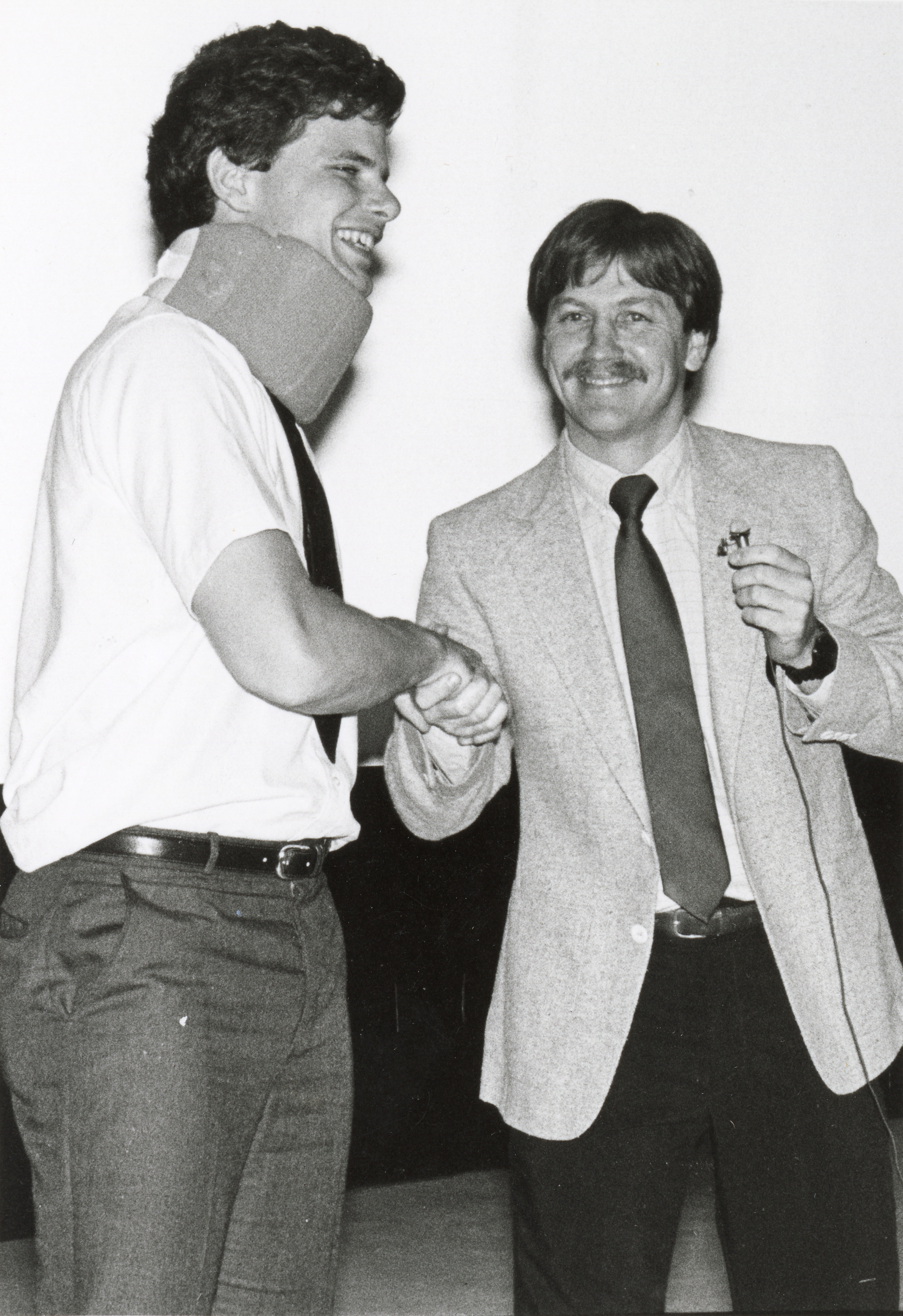 Photograph of James Noxon presenting at a college awards ceremony Item Info