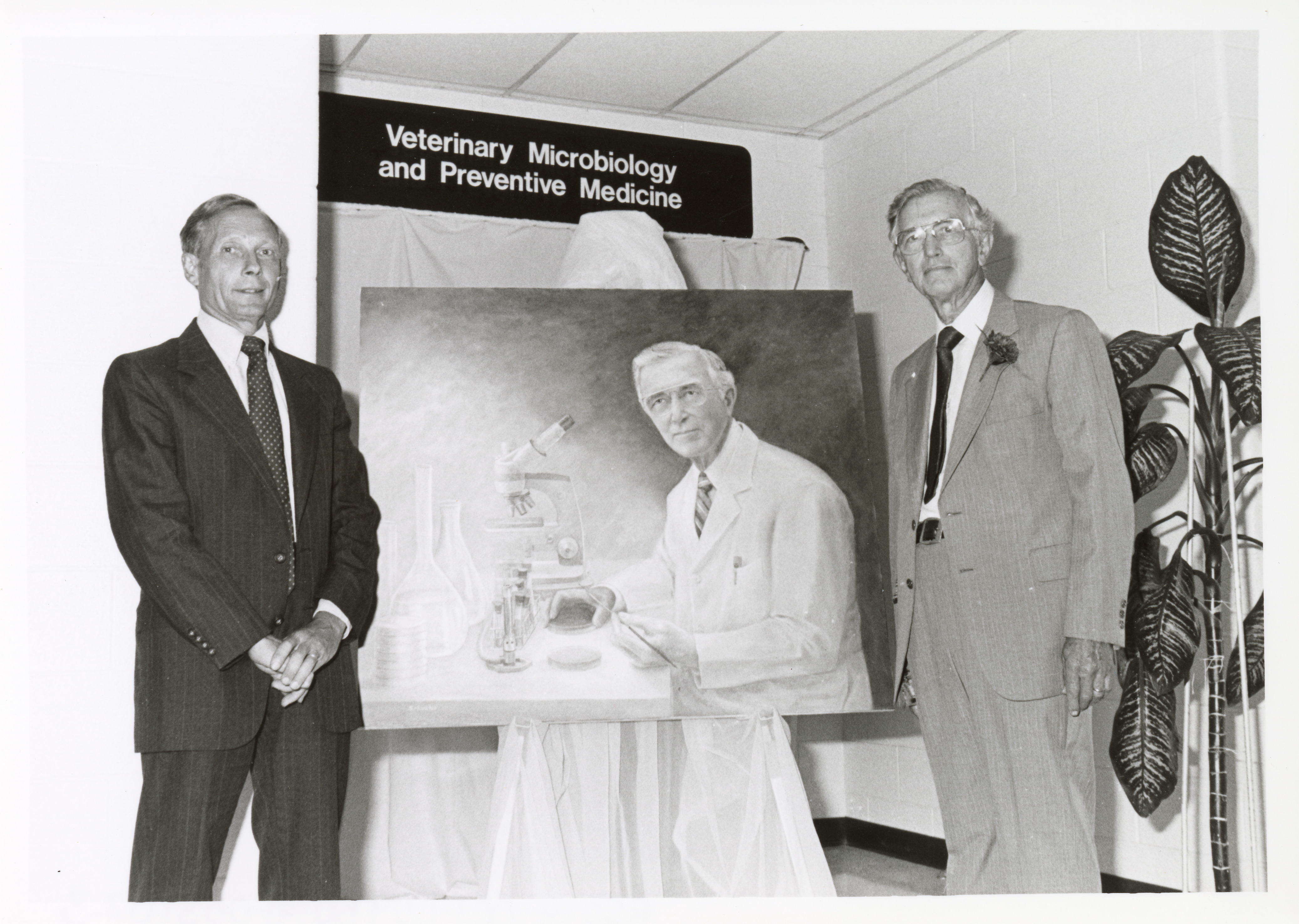 - Photograph of R. Allen Packer and Dean Pearson at the dedication of Packer's portrait in the microbiology lobby