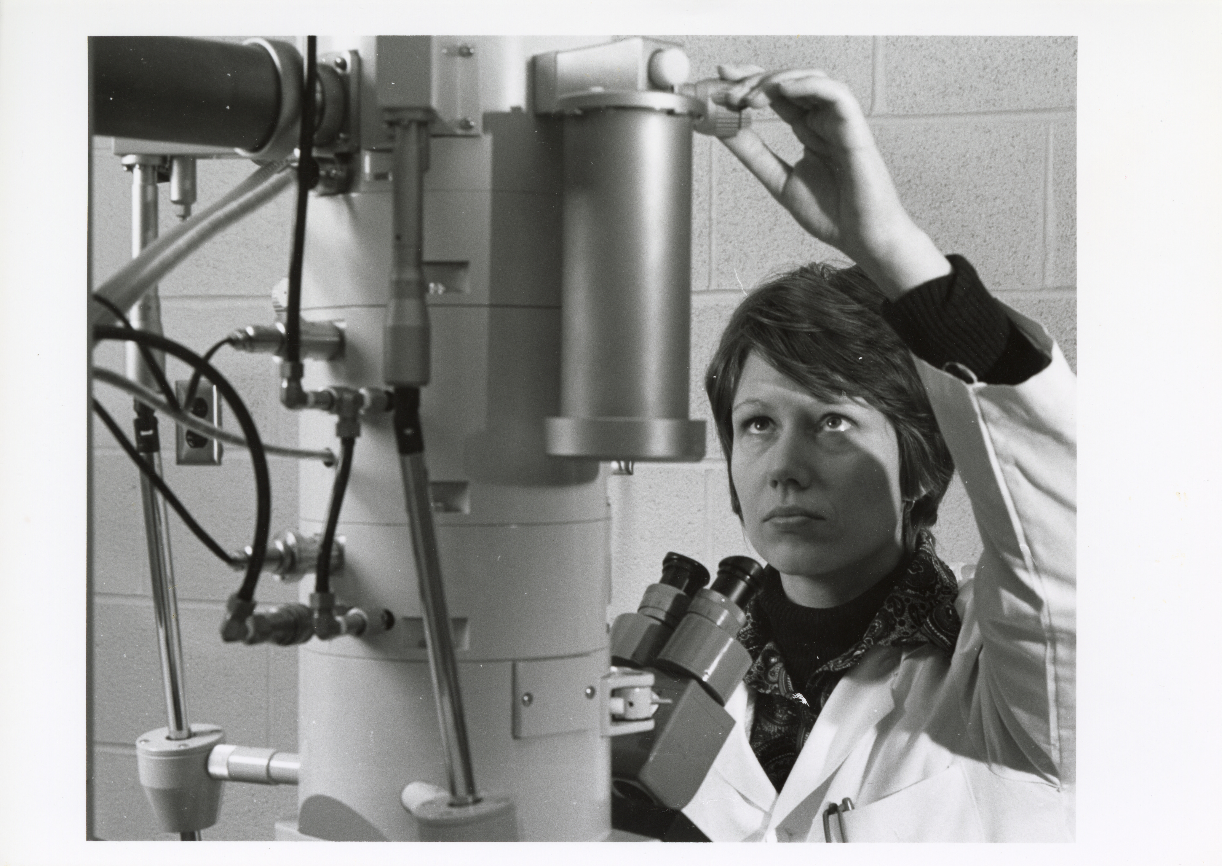 - Photograph of Jane Fagerland using the transmission electron microscope in the Department of Pathology