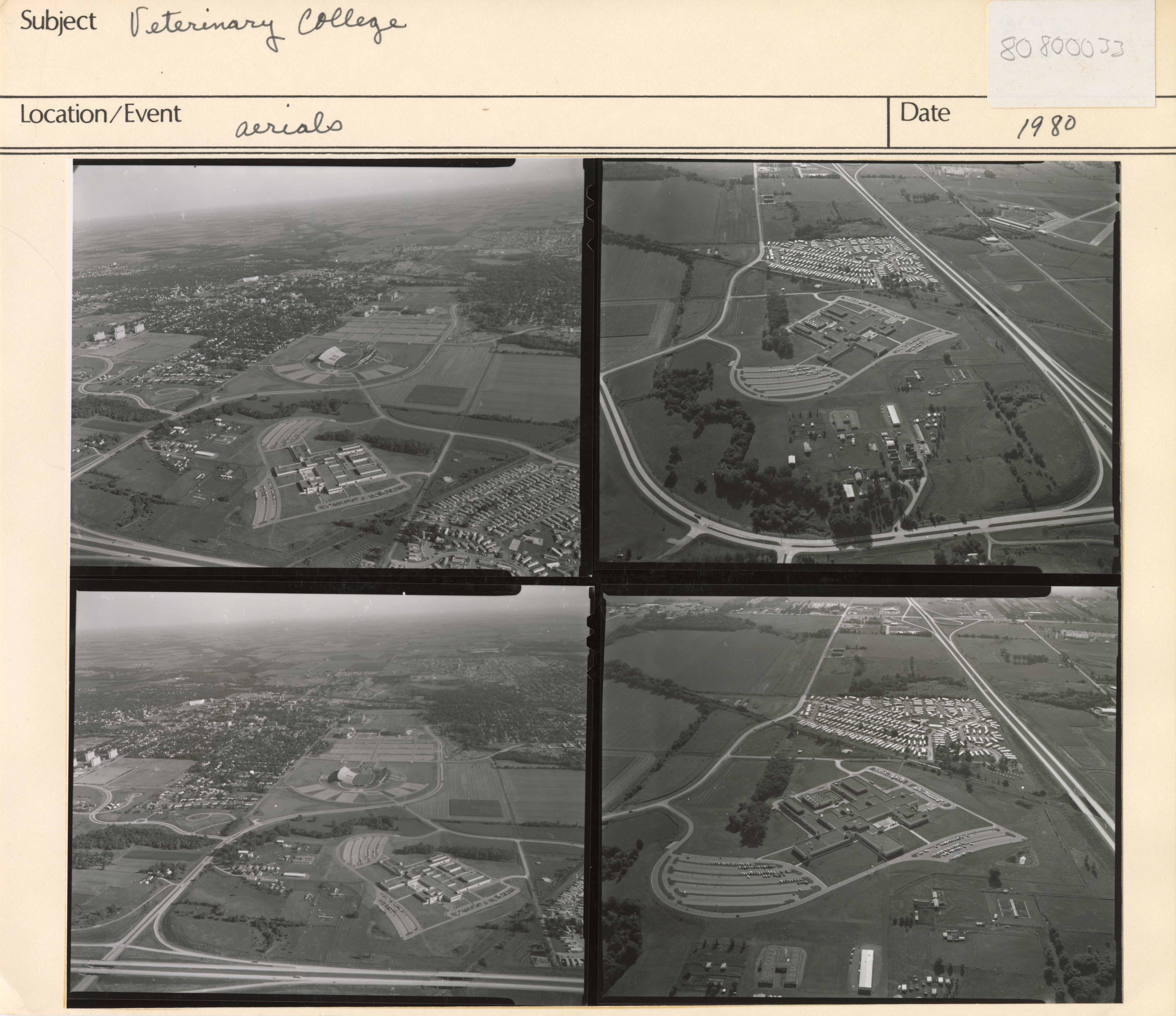 - Contact sheet with aerial photographs of the Veterinary Medical Research Institute and the College of Veterinary Medicine complex (later named Patterson Hall and Lloyd Veterinary Medical Center)