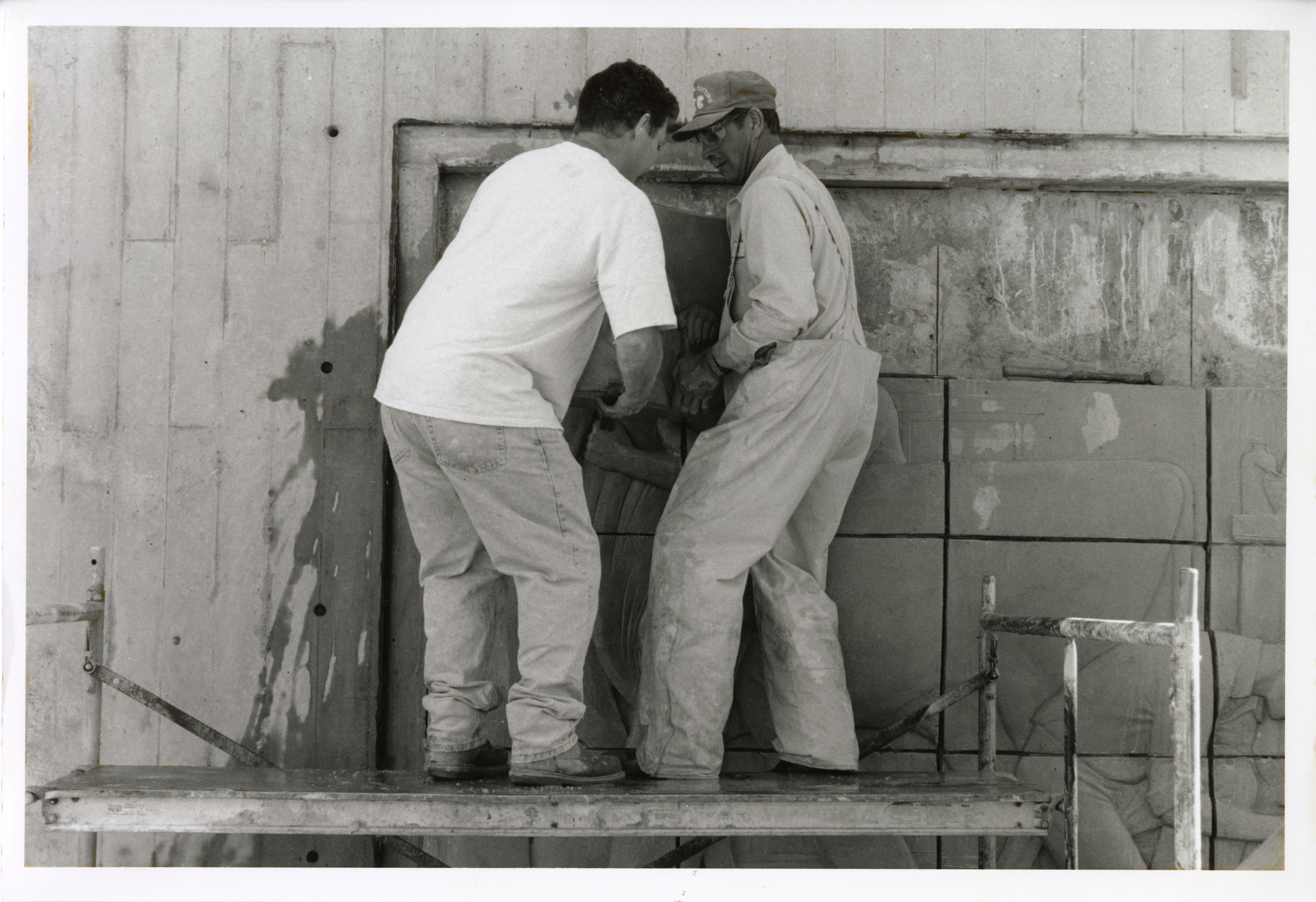 - Photograph of the Veterinary Medicine mural being removed for restoration
