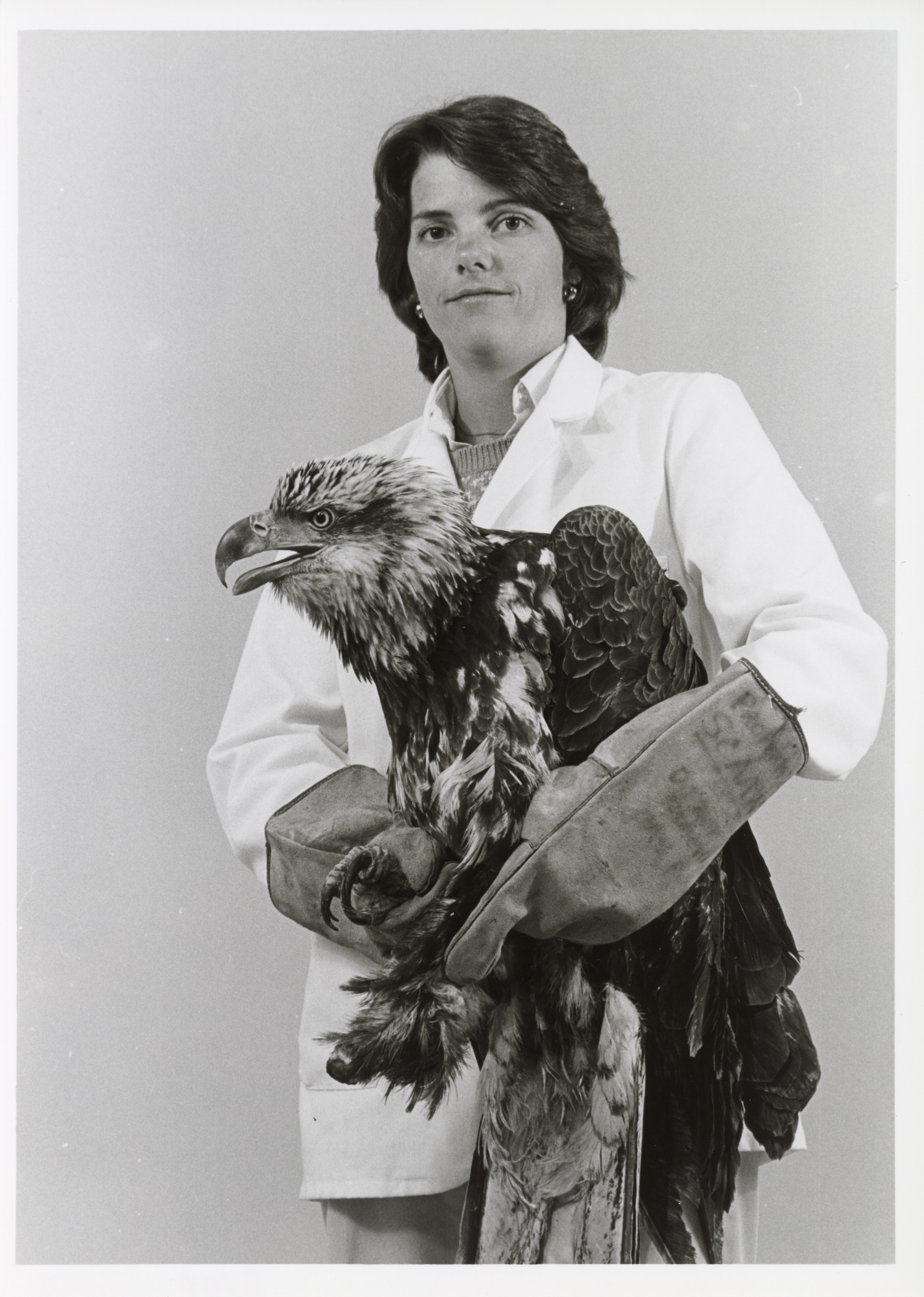 Photograph of Susan Barrows holding an injured eagle Item Info