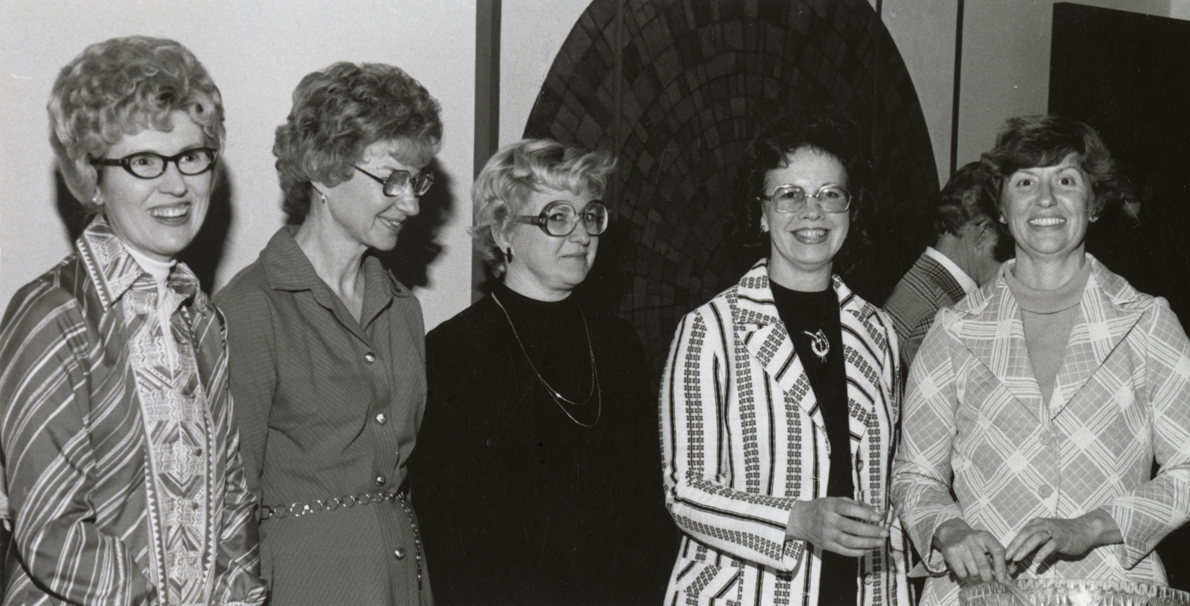 - Photograph of administrative secretaries Avis Andre, Pat Burns, Pattian Wright, Evelyn Stotts, and Nancy Clark