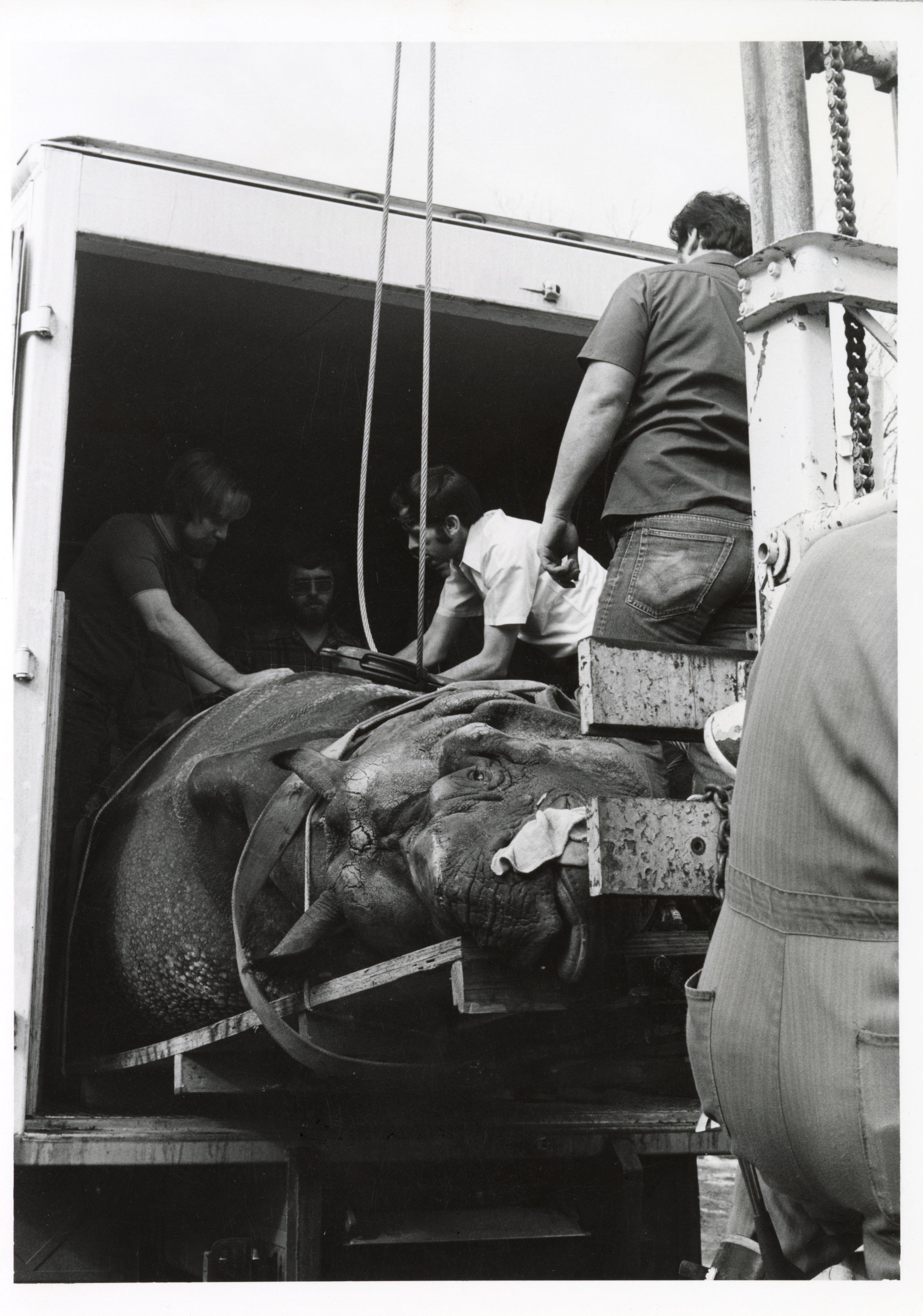 - Photograph of Tiny the hippo from Omaha being unloaded from truck