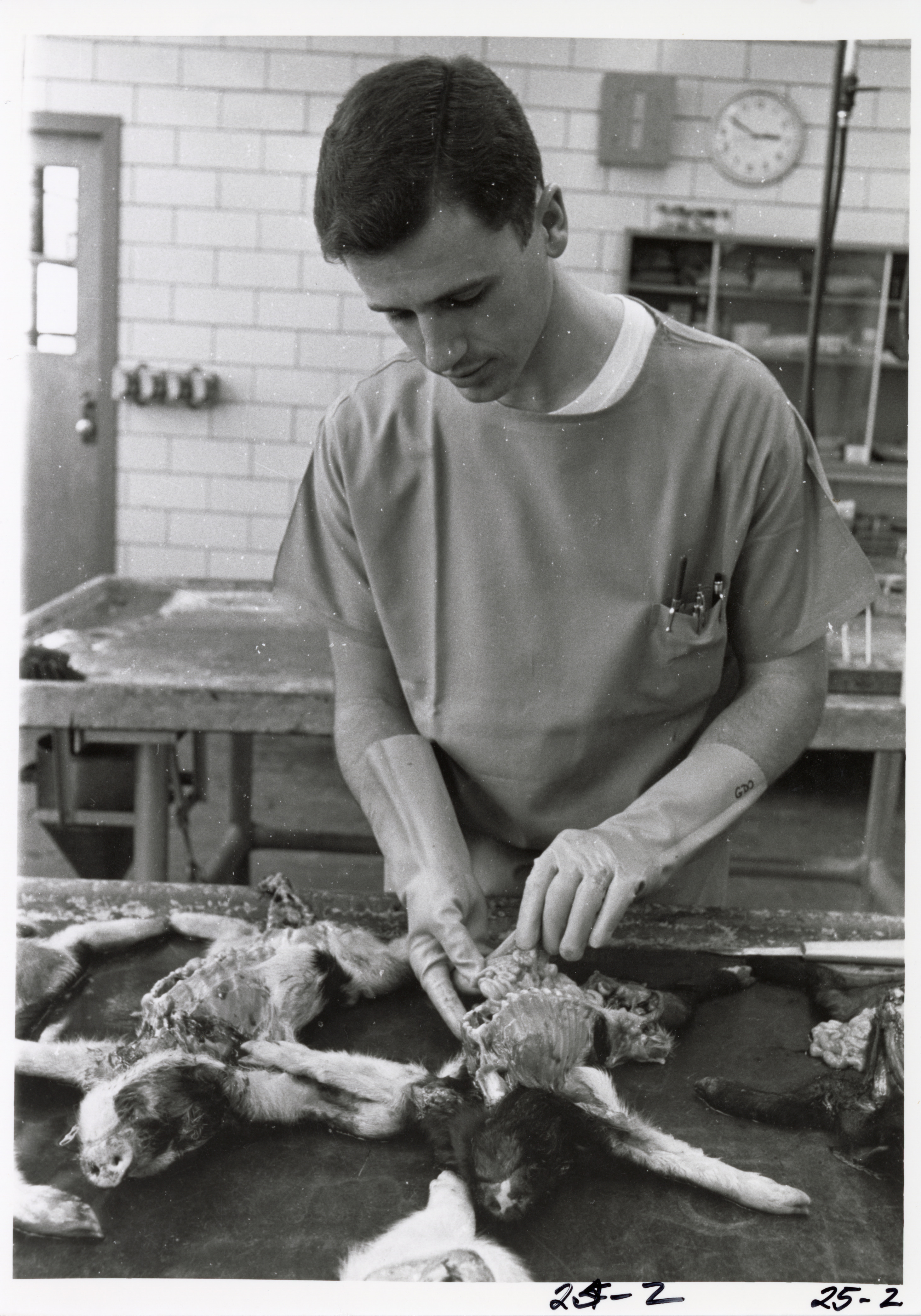 - Photograph of Gary Osweiler performing a piglet necropsy