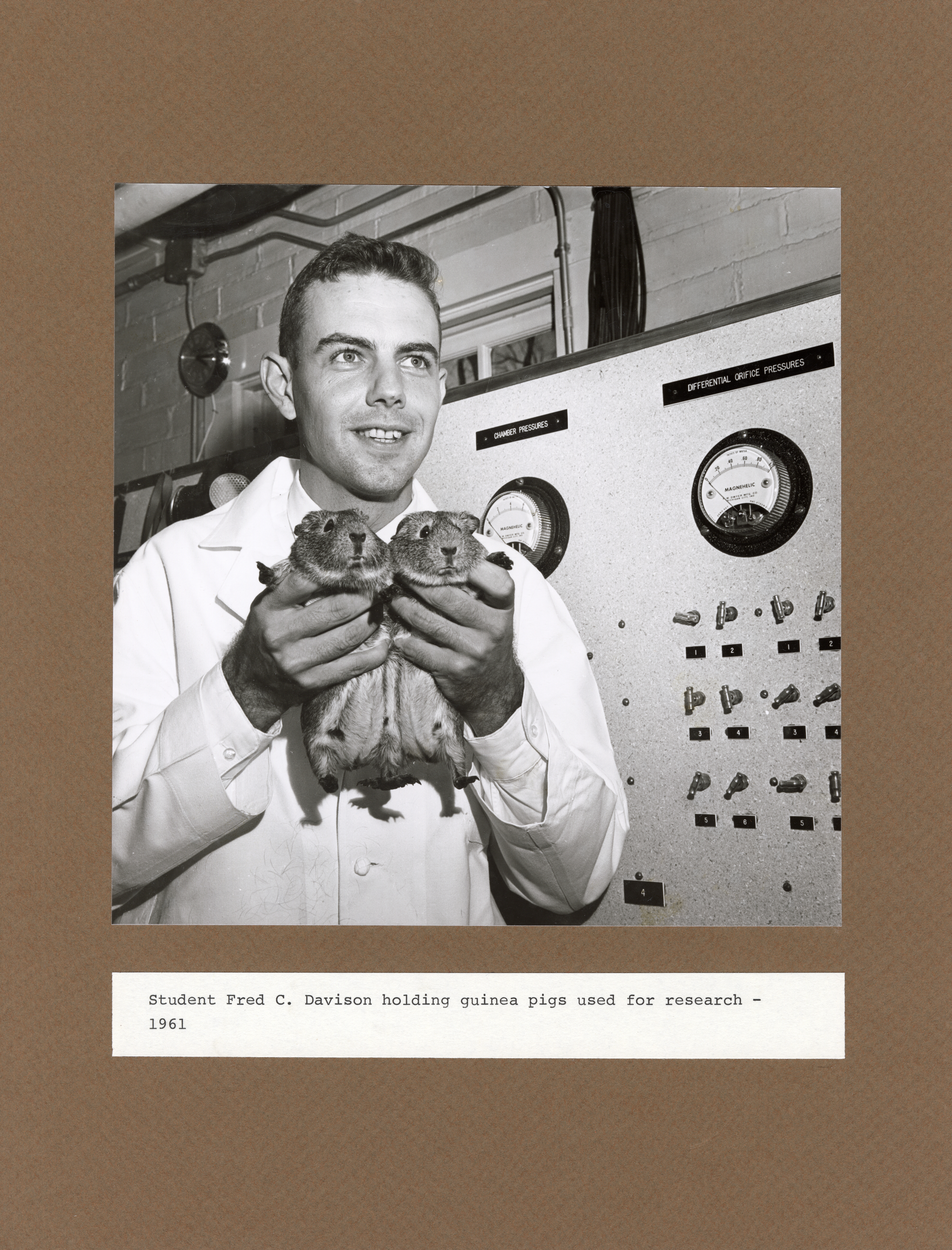 - Annotation: "Student Fred C. Davison holding guinea pigs used for research - 1961"