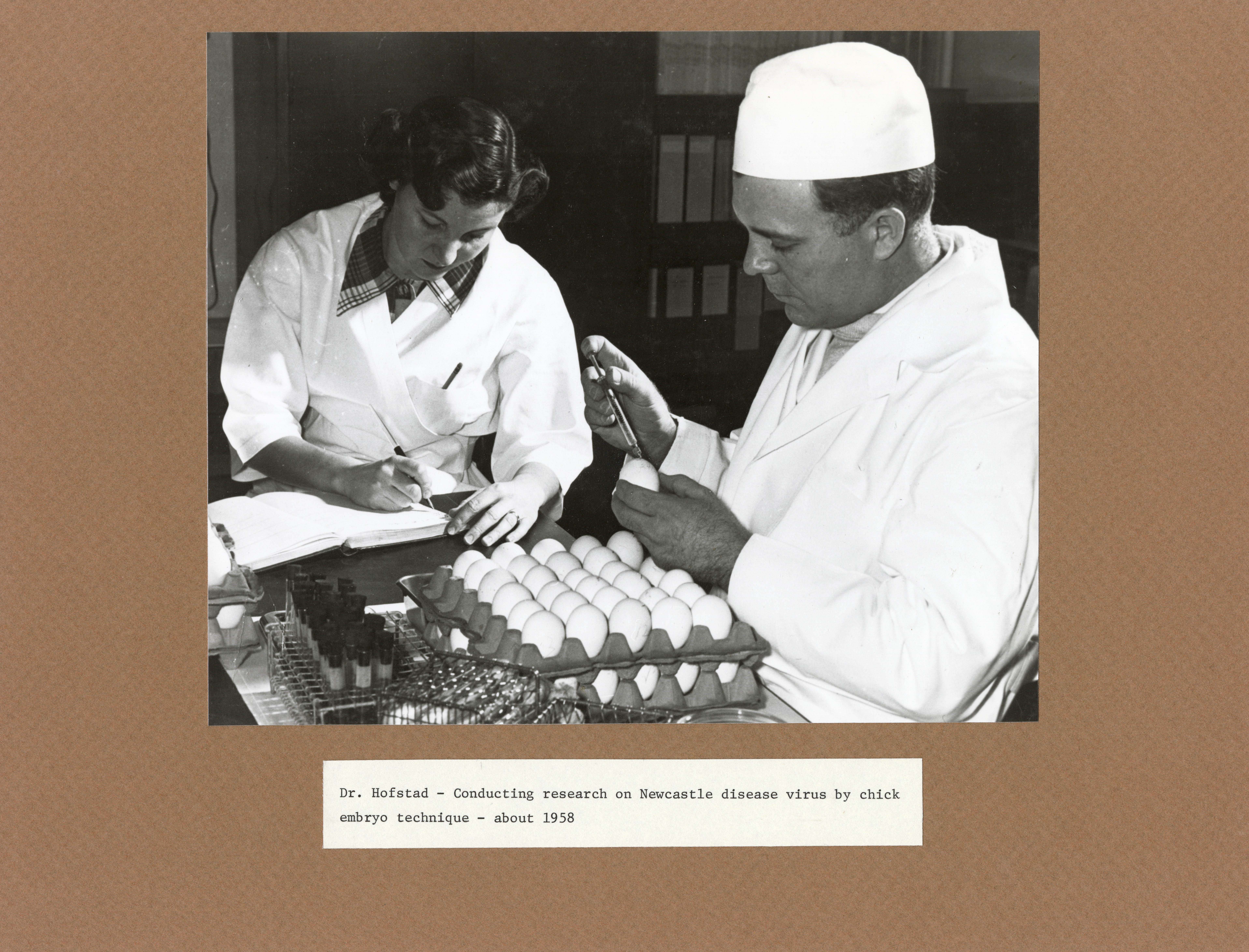 - "Photograph of Melvin Hofstad and a Veterinary Medical Research Institute technician inoculate embyonating chicken eggs with Newcastle virus", Iowa State University College of Veterinary Medicine Collection, Iowa State University Library Digital Collections