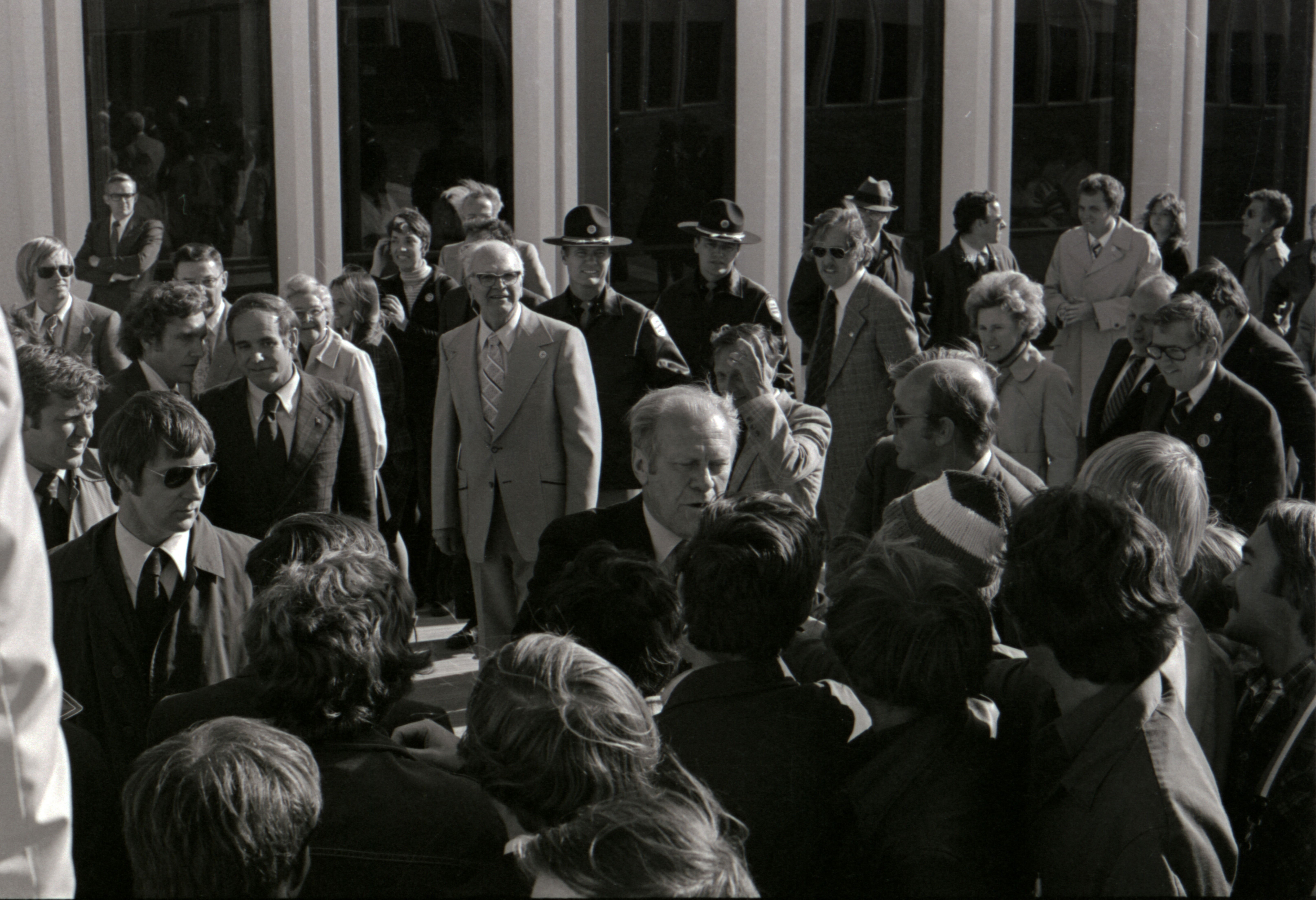 Photograph of President Gerald Ford's visit to the Iowa State University College of Veterinary Medicine building Item Info