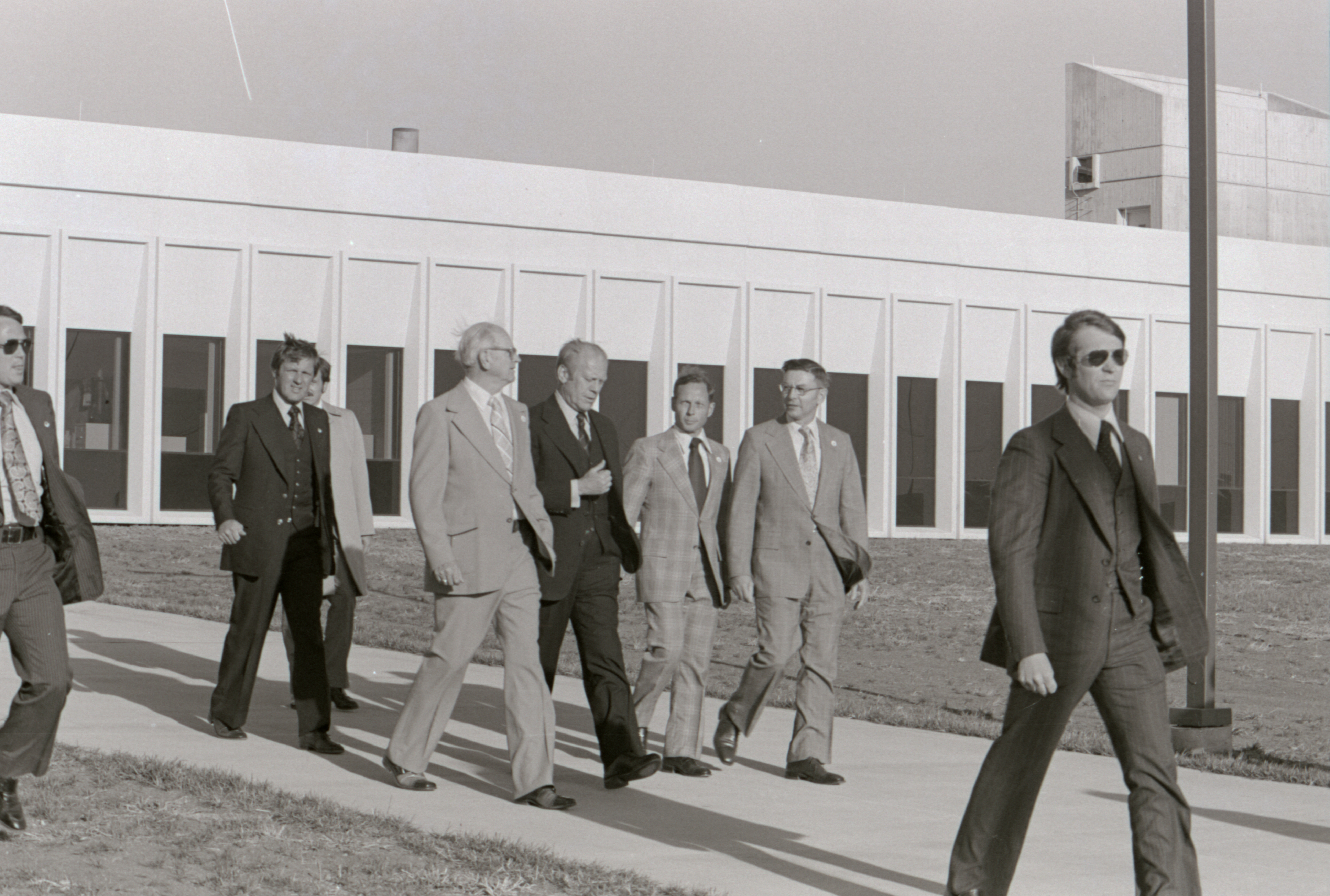 - Photograph of the presidential motorcade and Gerald Ford's tour of the Iowa State University College of Veterinary Medicine building