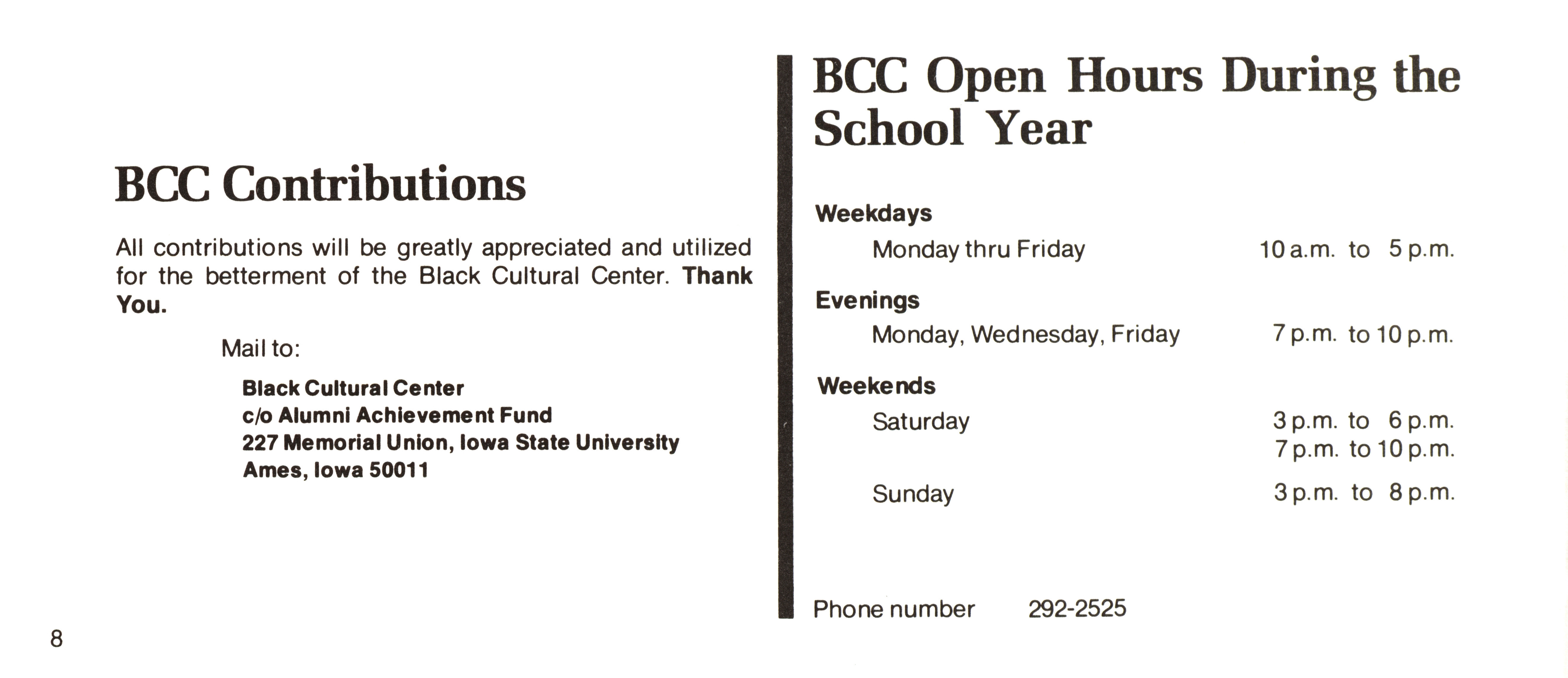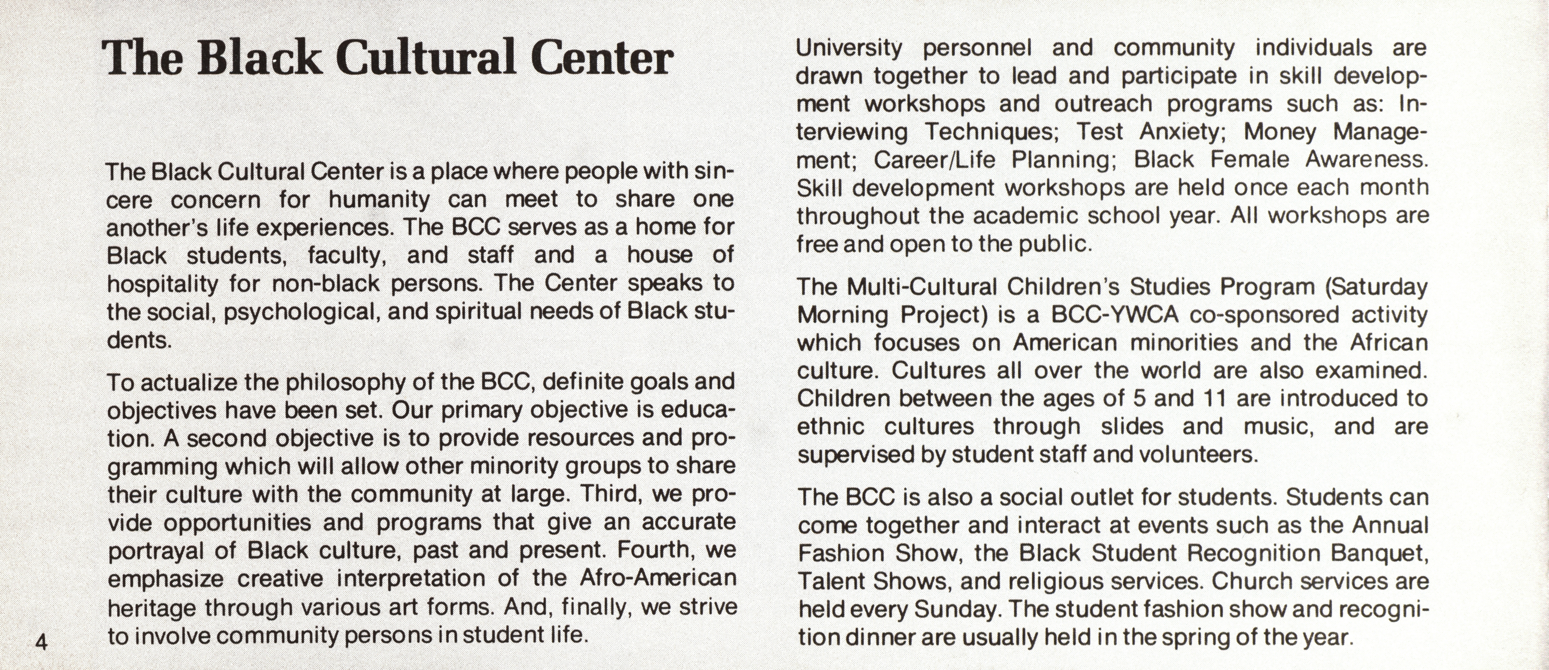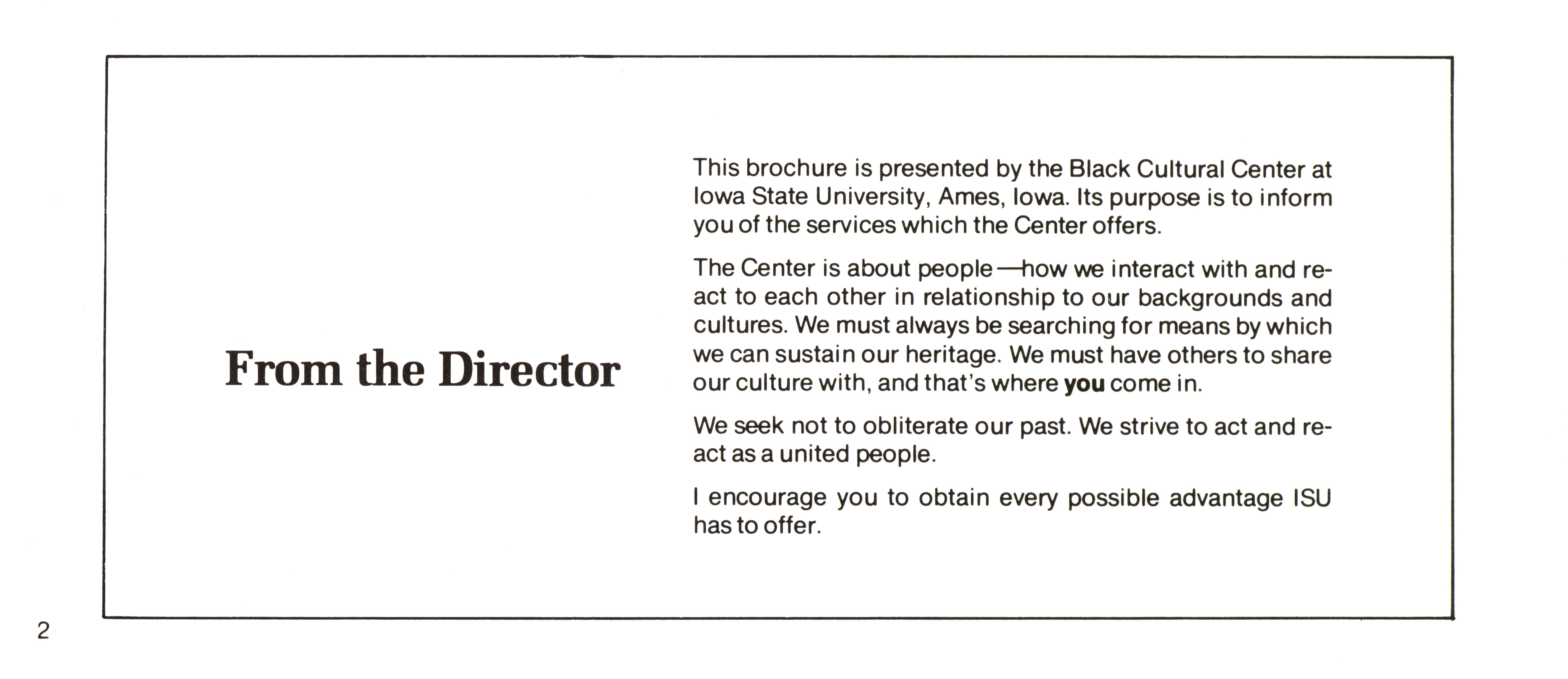 - Brochure describing the purpose, function, activities, and services associated with the Black Cultural Center at Iowa State University.