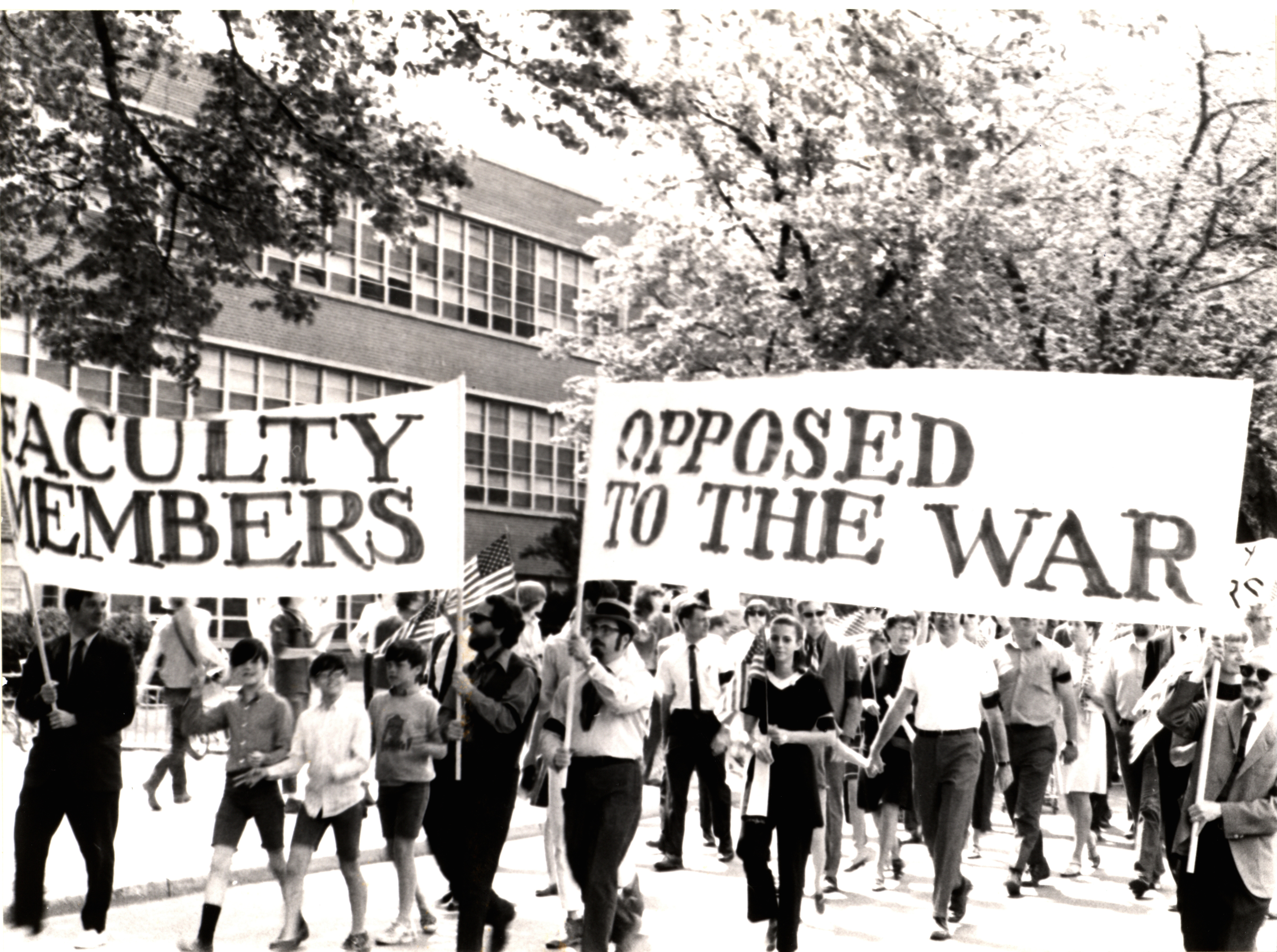 - A photograph showing Iowa State University faculty members and their families at the start of the "March of Concern," a VEISHEA parade antiwar demonstration.