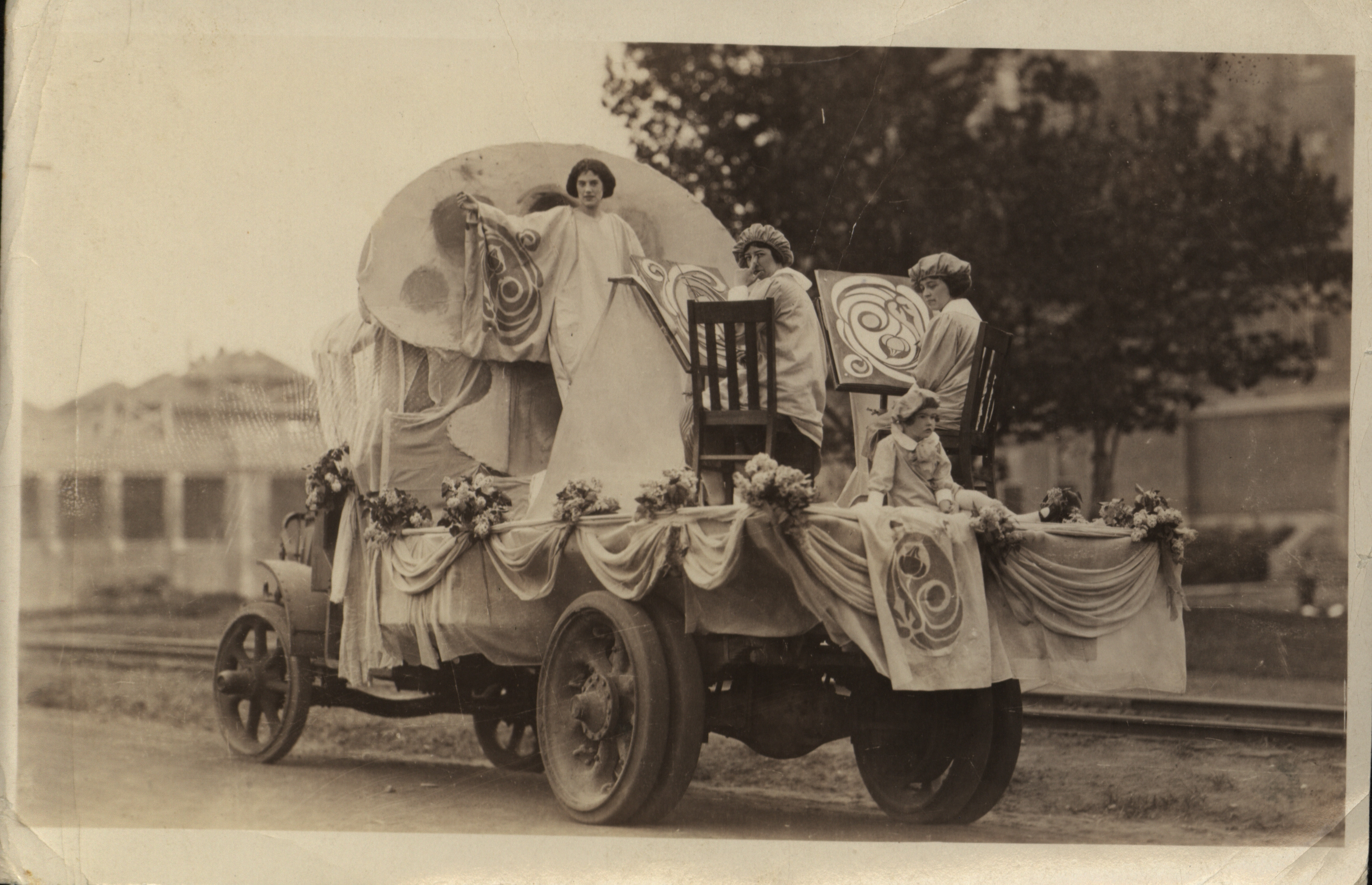 - A VEISHEA parade float from the 1922 celebration. Two students are seen painting, while one is posing.
