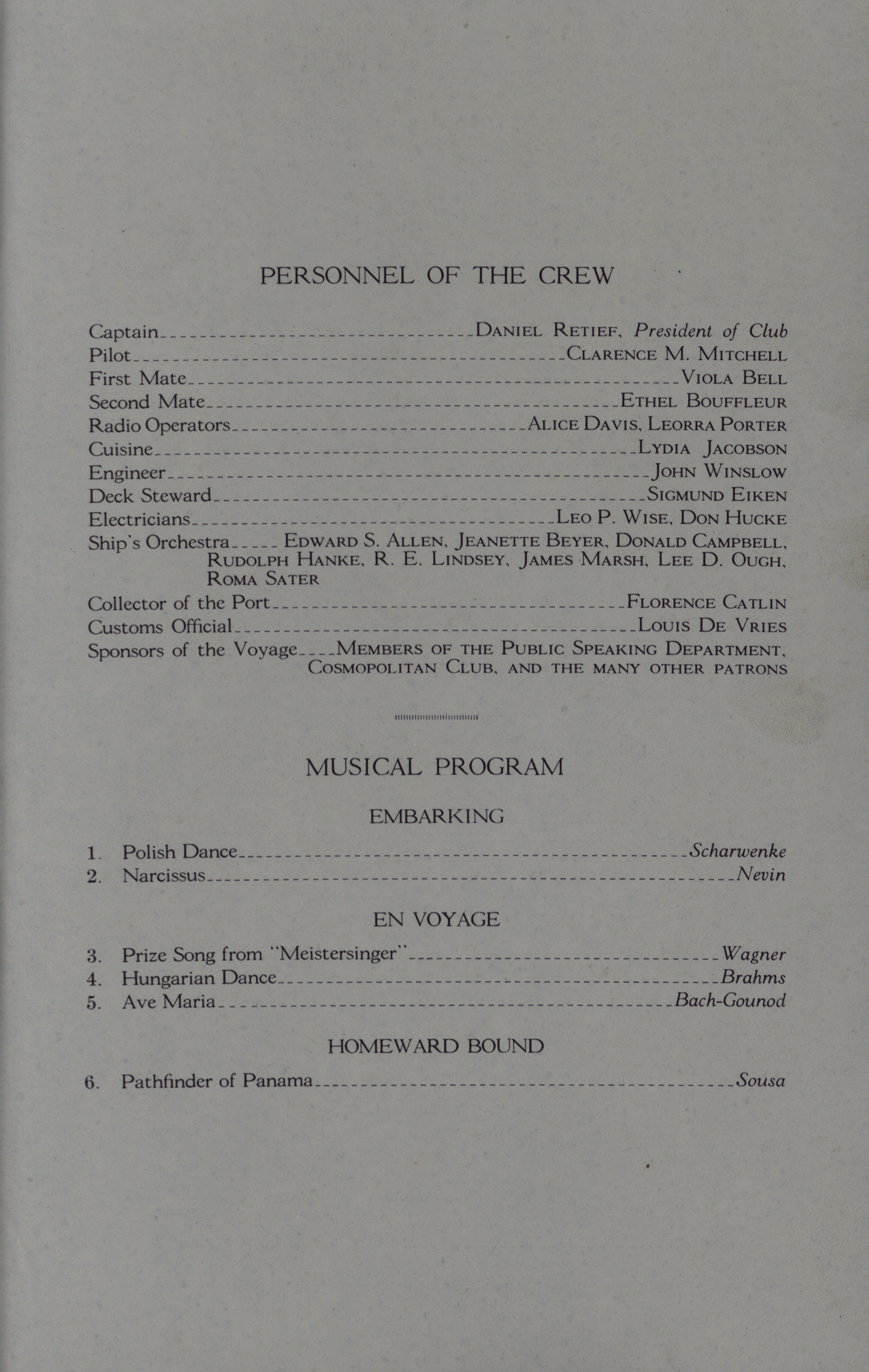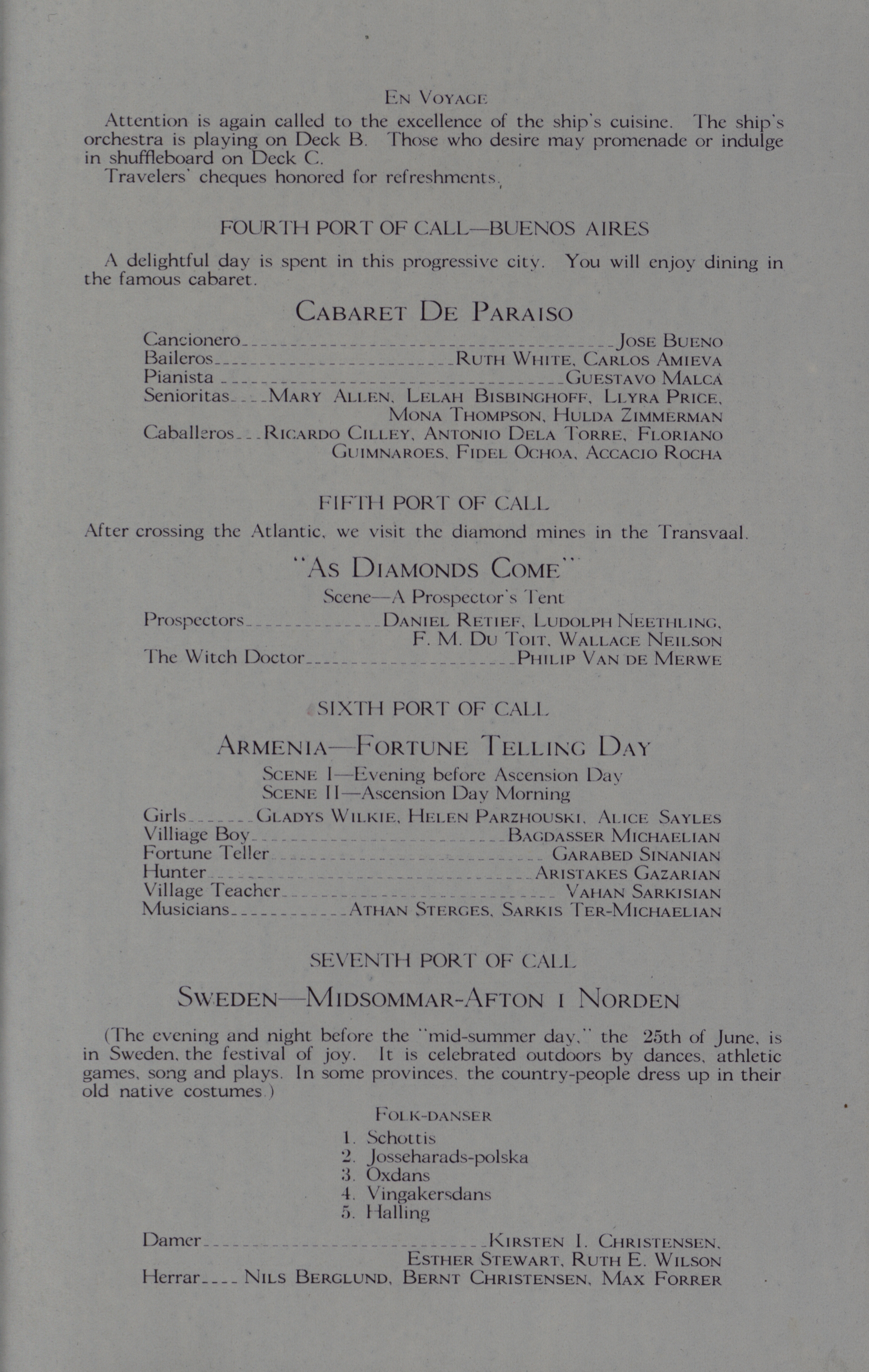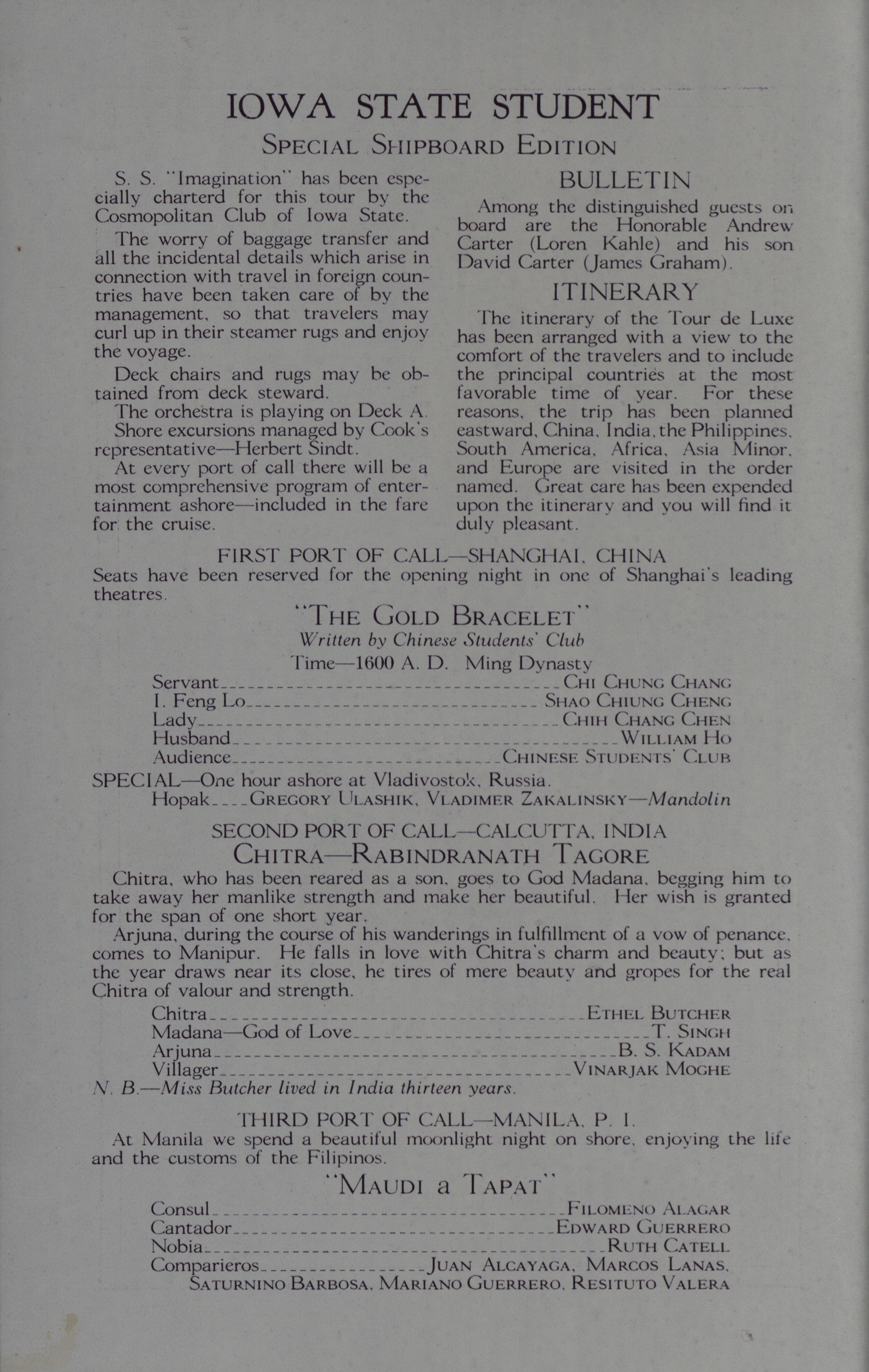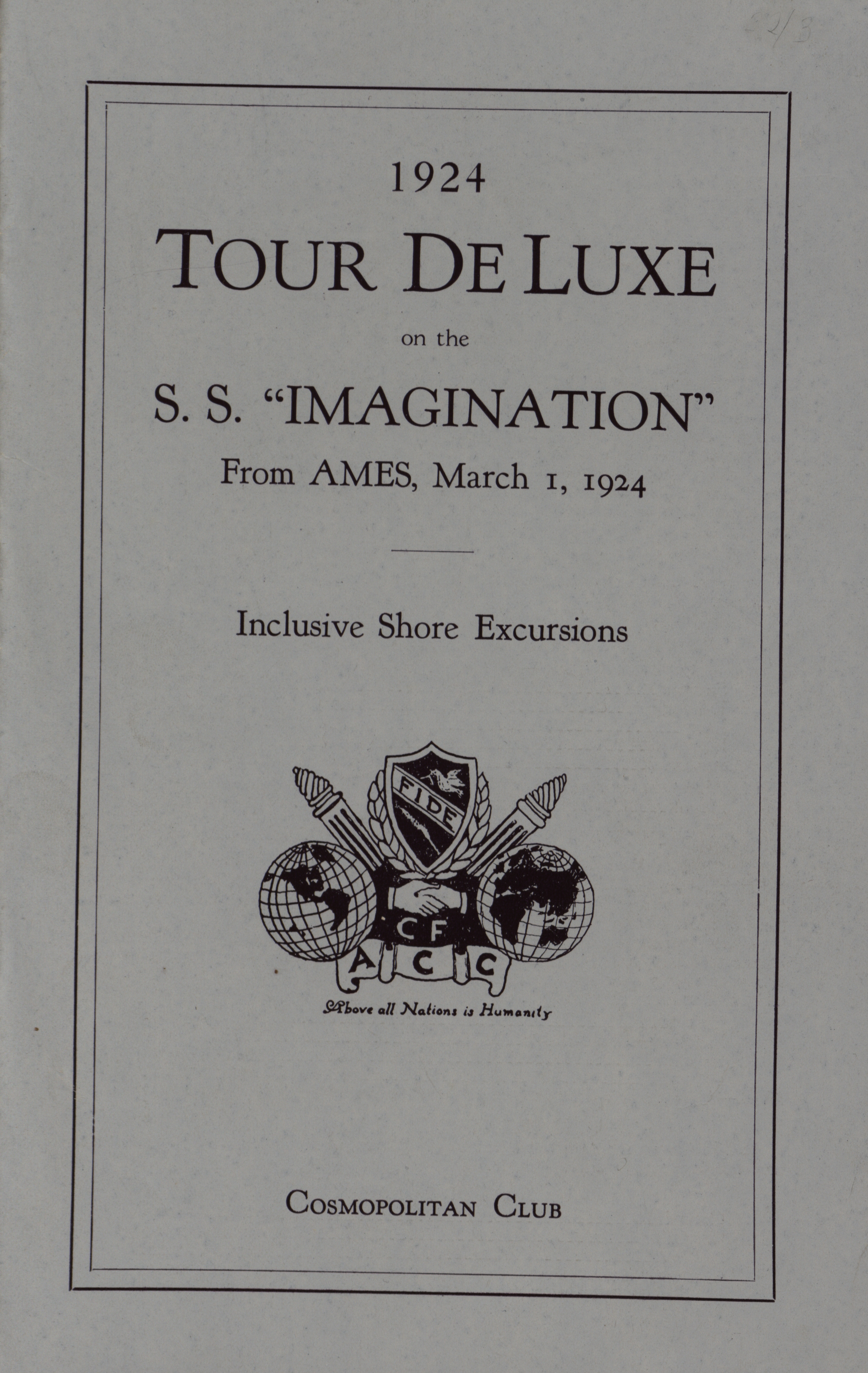 - Program for the Cosmopolitan Club's 1924 annual international review titled "Tour De Luxe on the S.S. 'Imagination.'" Countries' cultures on display included India, China, the Philippine Islands, Argentina, South Africa, Armenia, and Sweden.