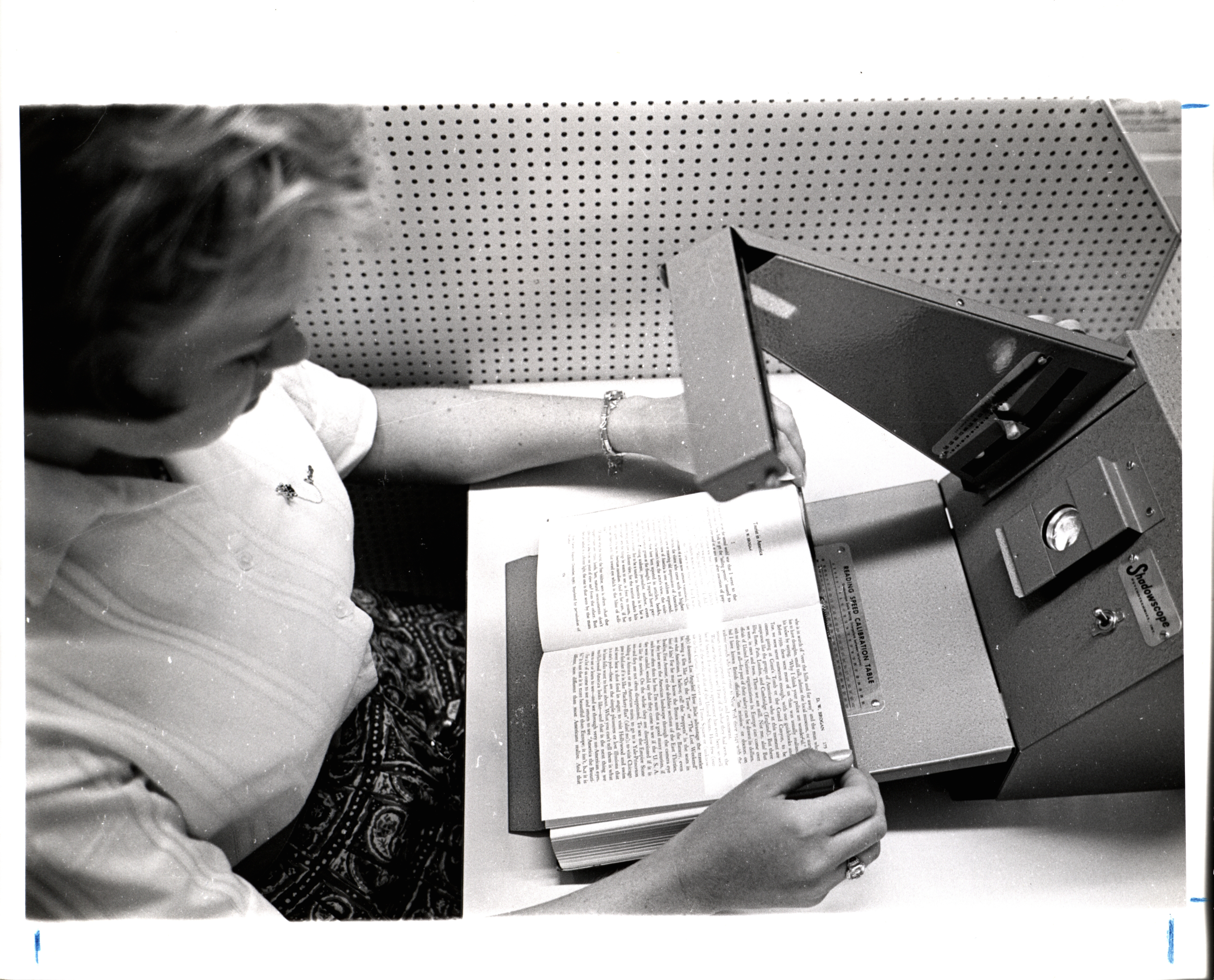 - A photograph showing a student demonstrating a reading machine in the Pearson Hall reading lab.