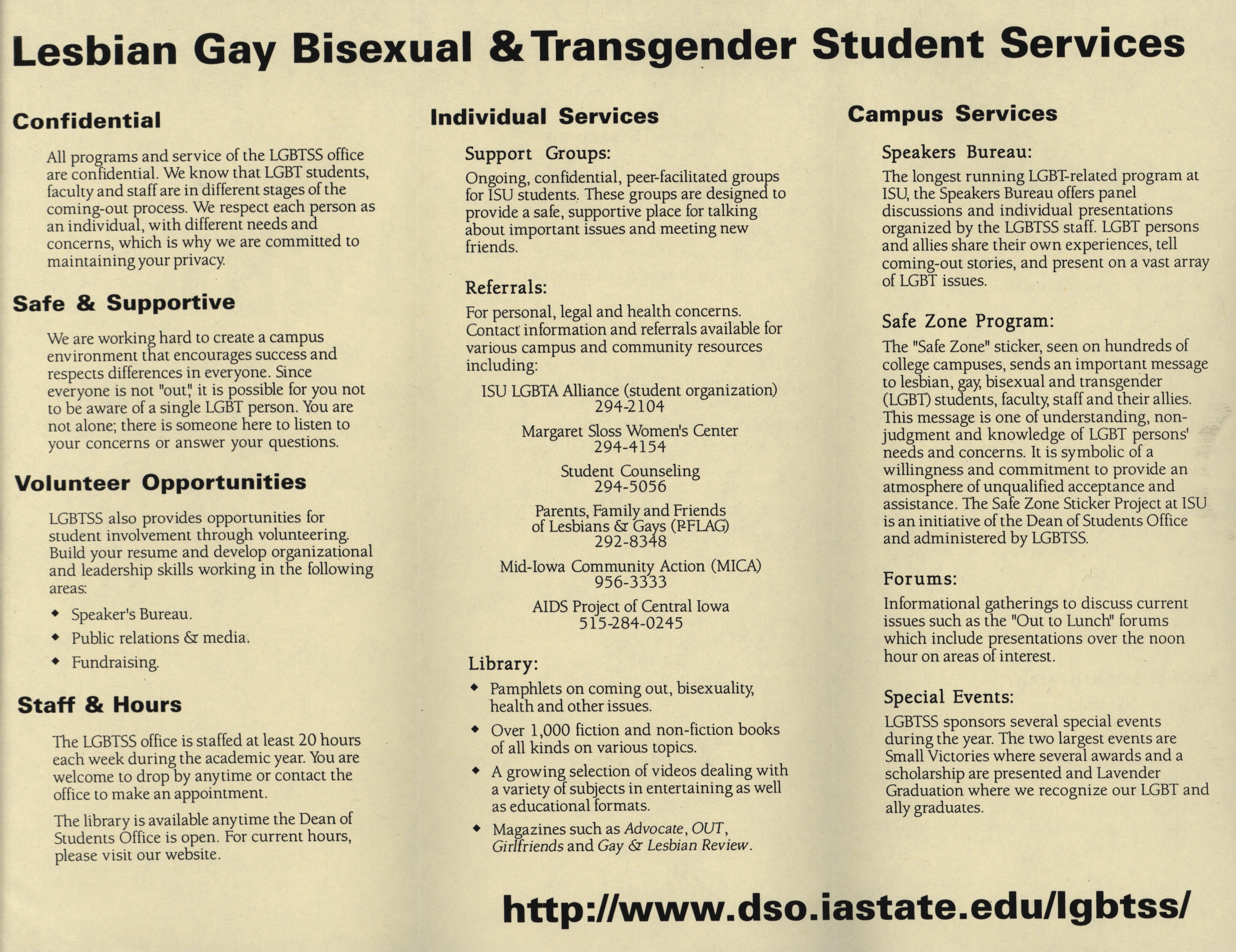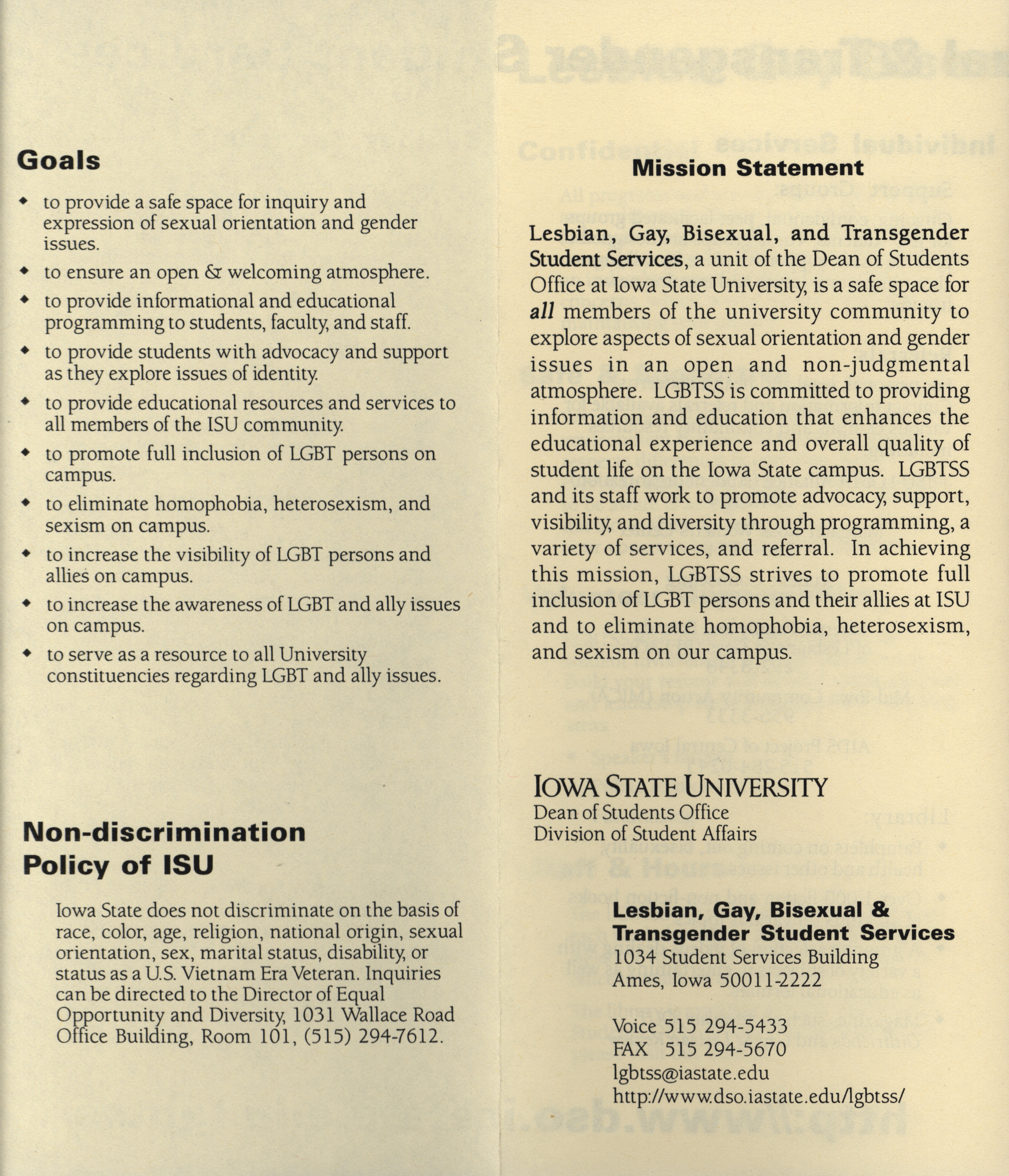 - A brochure from the Lesbian, Gay, Bisexual & Transgender Student Services Office at Iowa State University. The brochure describes their mission, the services they offer, and the goals of the office.