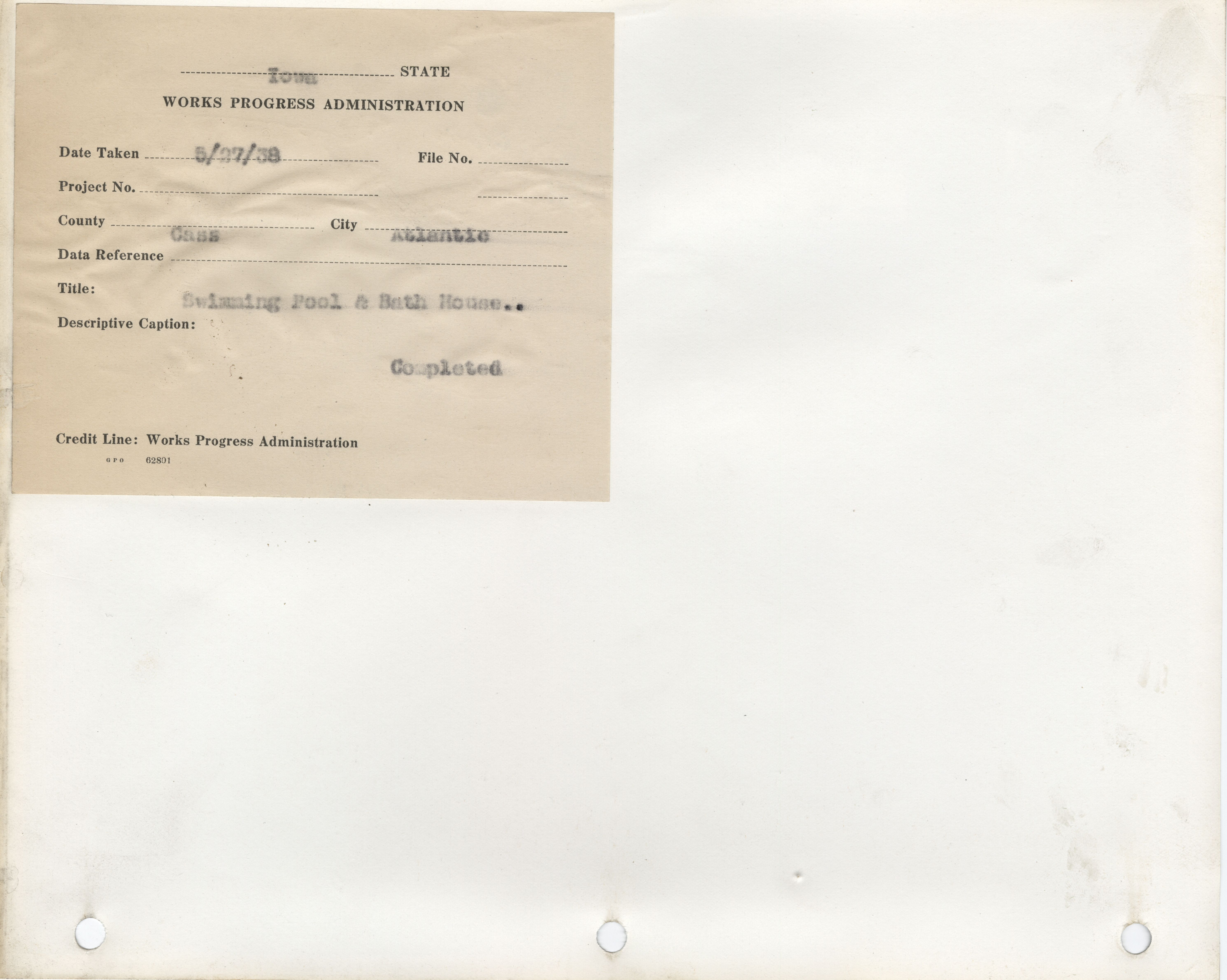 - Stadiums and Swimming Pools. Cass County. Atlantic. Swimming Pool at Sunnyside Park. Project 2033. (5 b/w photographs), 1936-1938, undated
