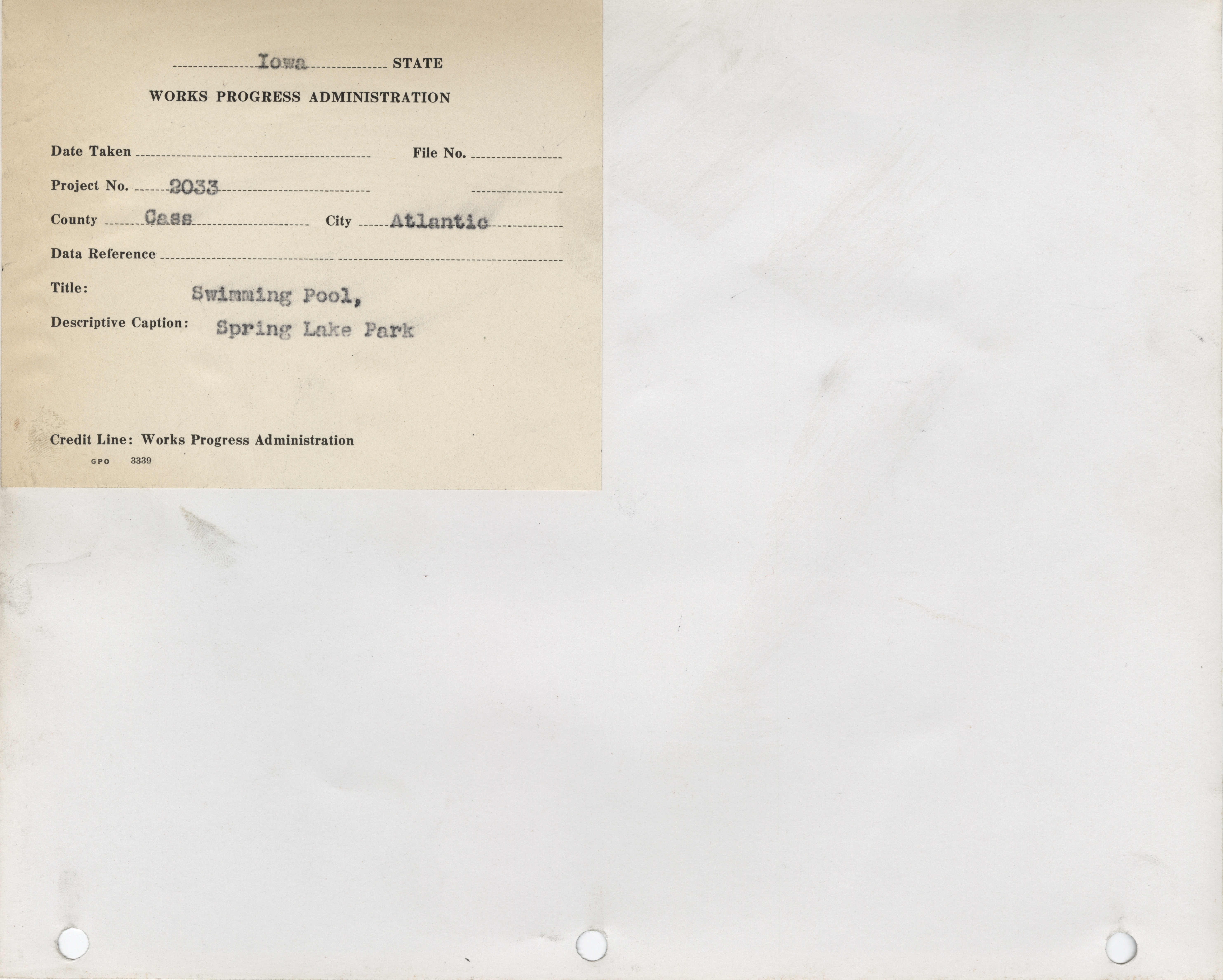- "Photograph of the swimming pool under construction at the Spring Lake Park in Atlantic", Work Projects Administration (Iowa) Photographs, Iowa State University Library Digital Collections