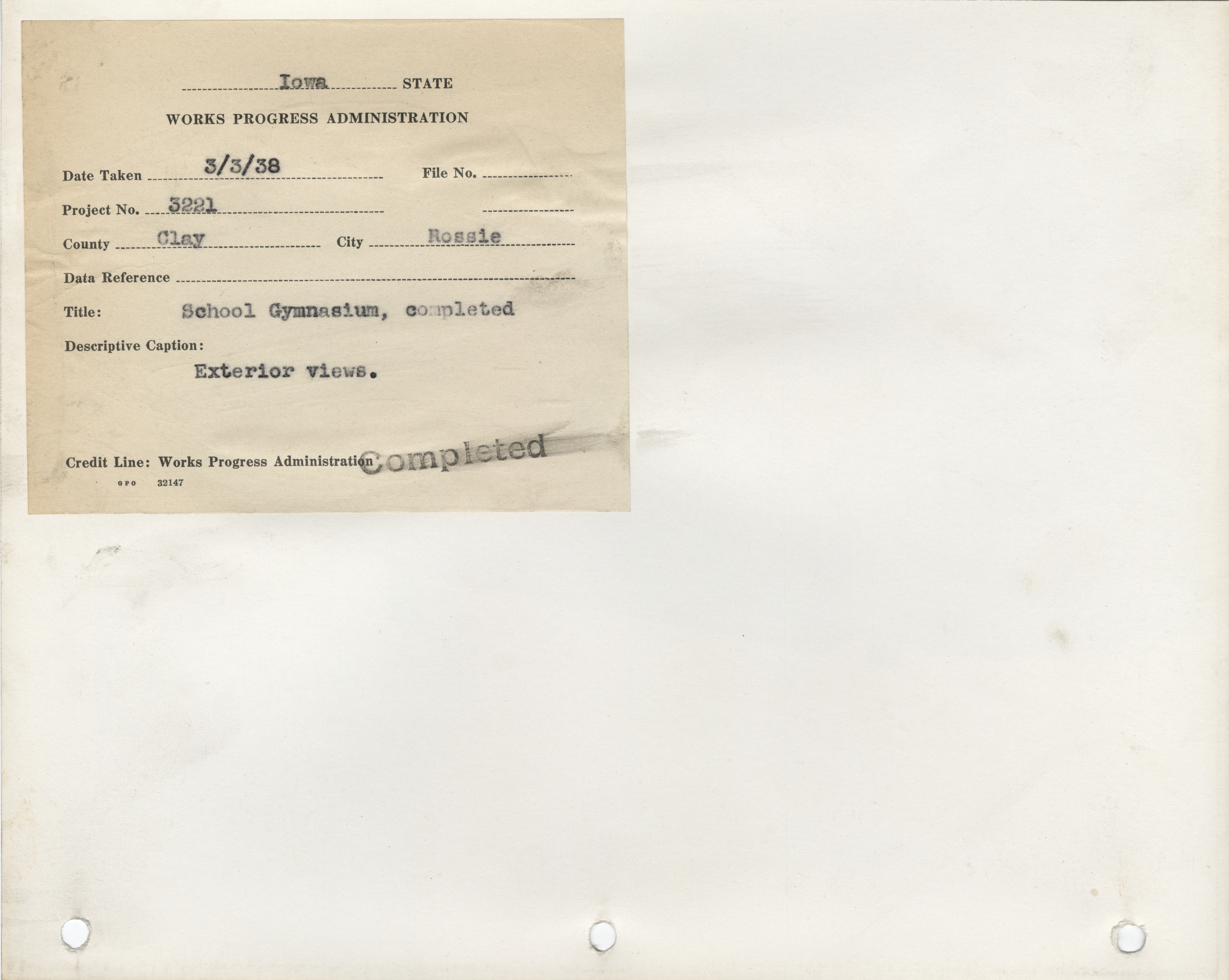 - "Photograph of the exterior view of the school gymnasium in Rossie", Work Projects Administration (Iowa) Photographs, Iowa State University Library Digital Collections