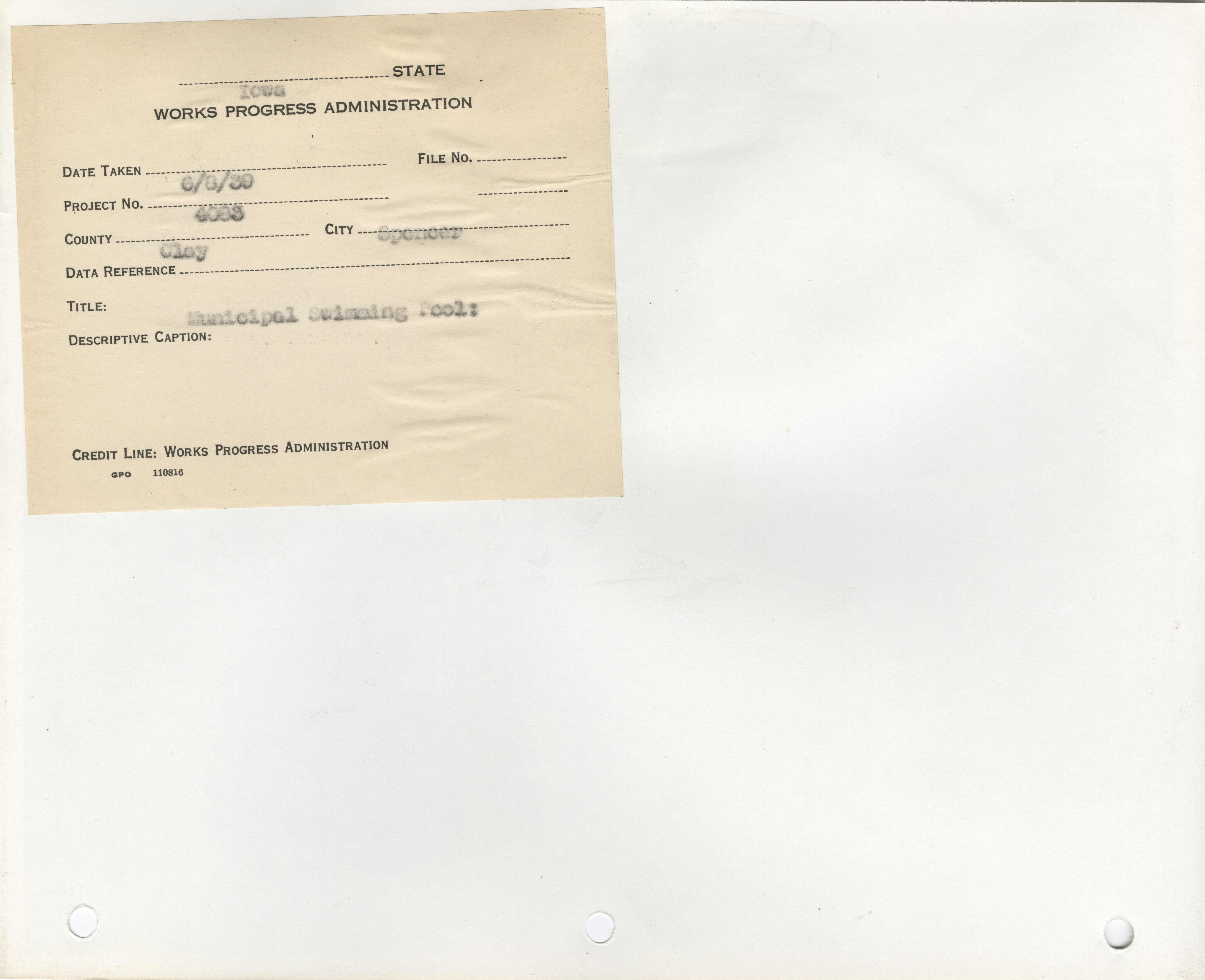 - "Photograph of people using the municipal swimming pool in Spencer", Work Projects Administration (Iowa) Photographs, Iowa State University Library Digital Collections