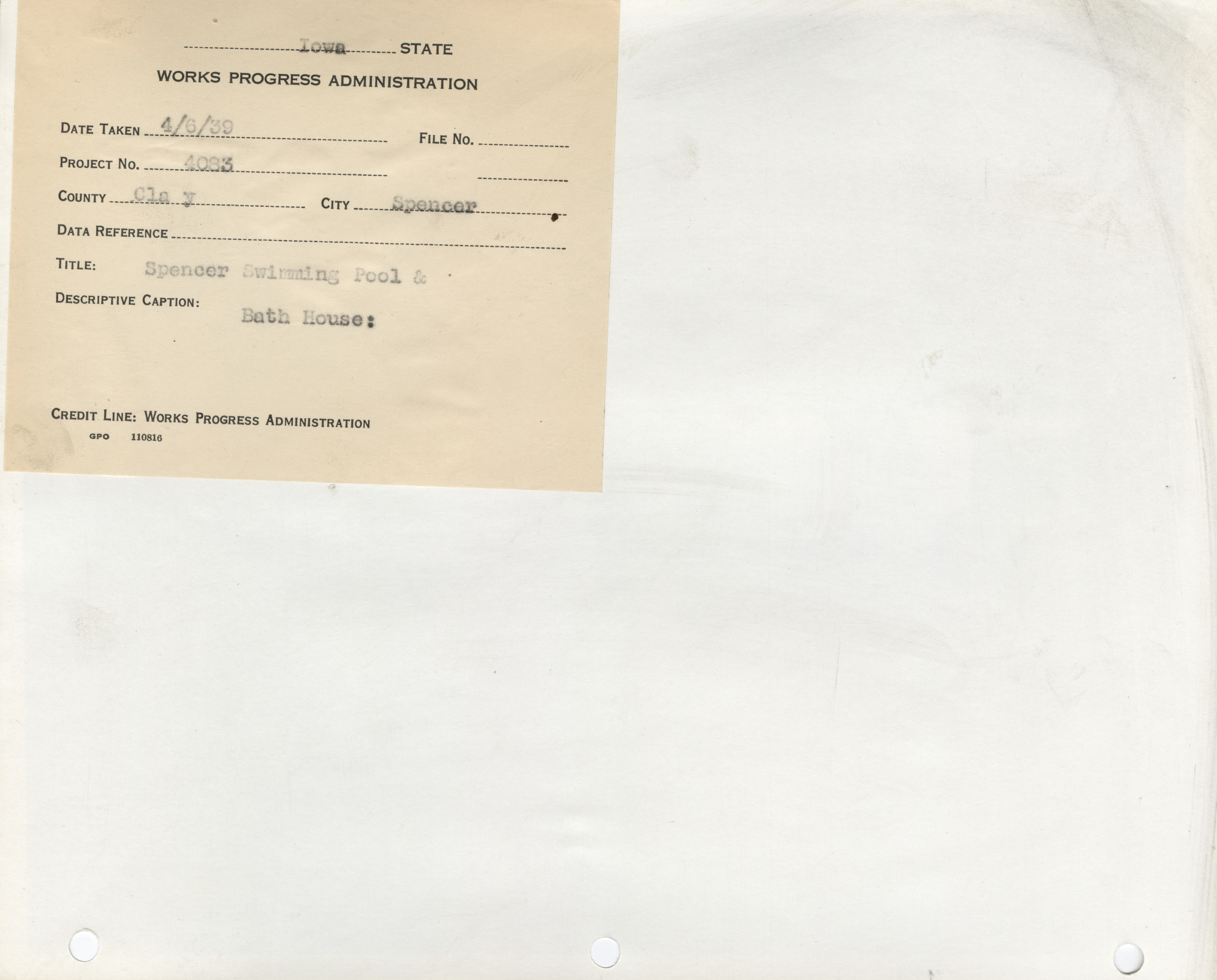 - Stadiums and Swimming Pools. Clay County. Spencer. Swimming Pool. Project 4083. (9 b/w photographs), 1939