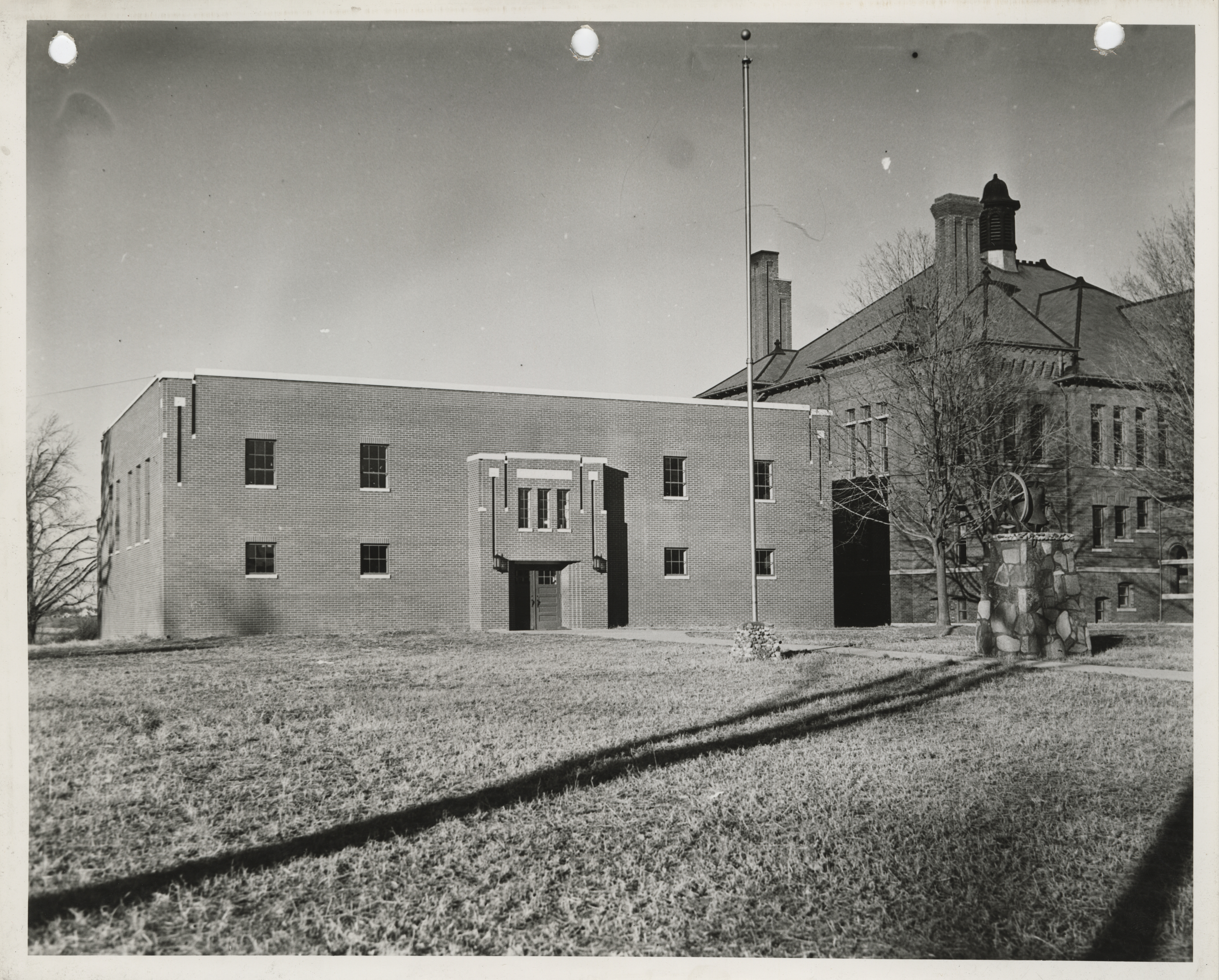 - Photograph of the exterior view of the high school gymnasium in Panora