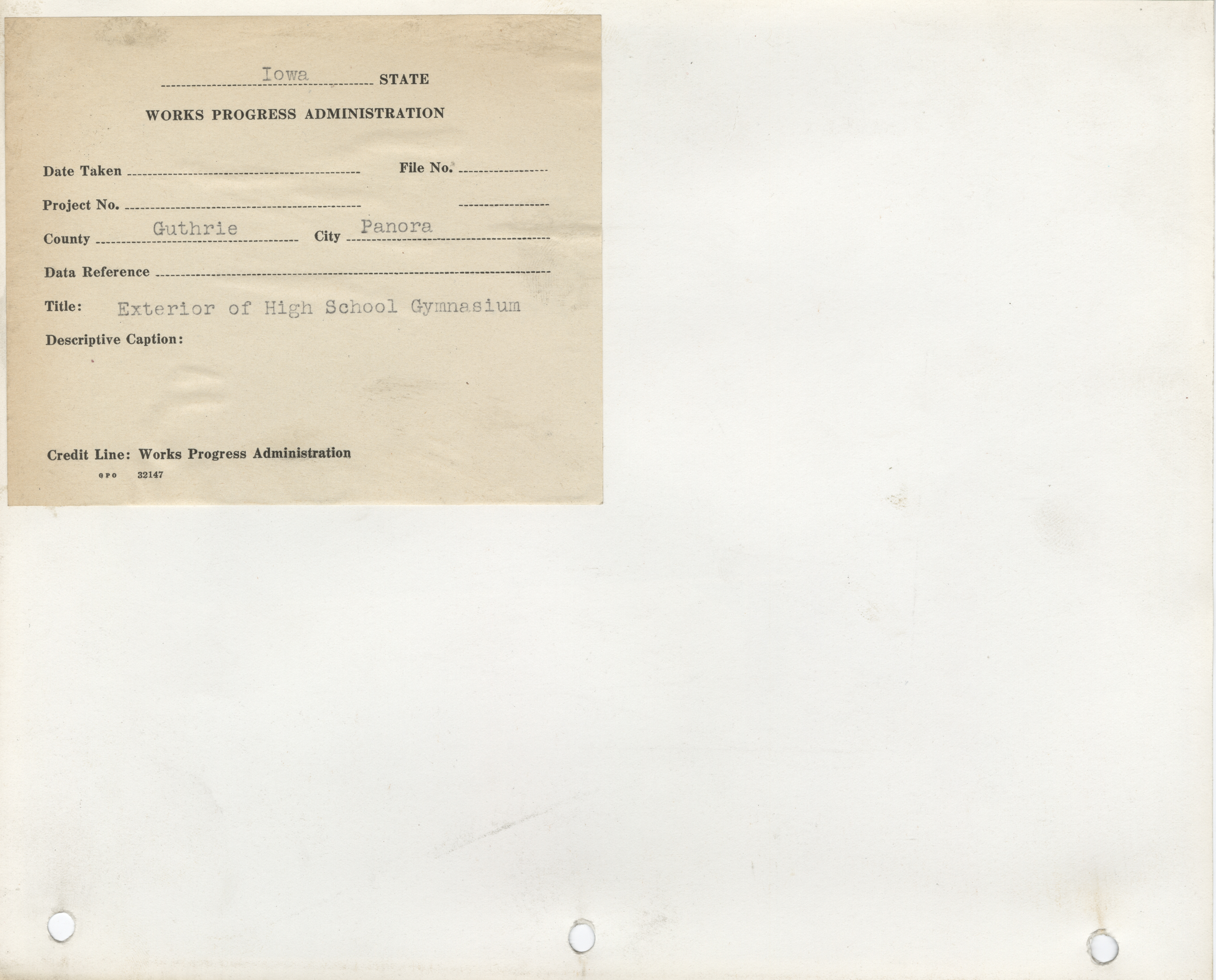 - "Photograph of the exterior view of the high school gymnasium in Panora", Work Projects Administration (Iowa) Photographs, Iowa State University Library Digital Collections