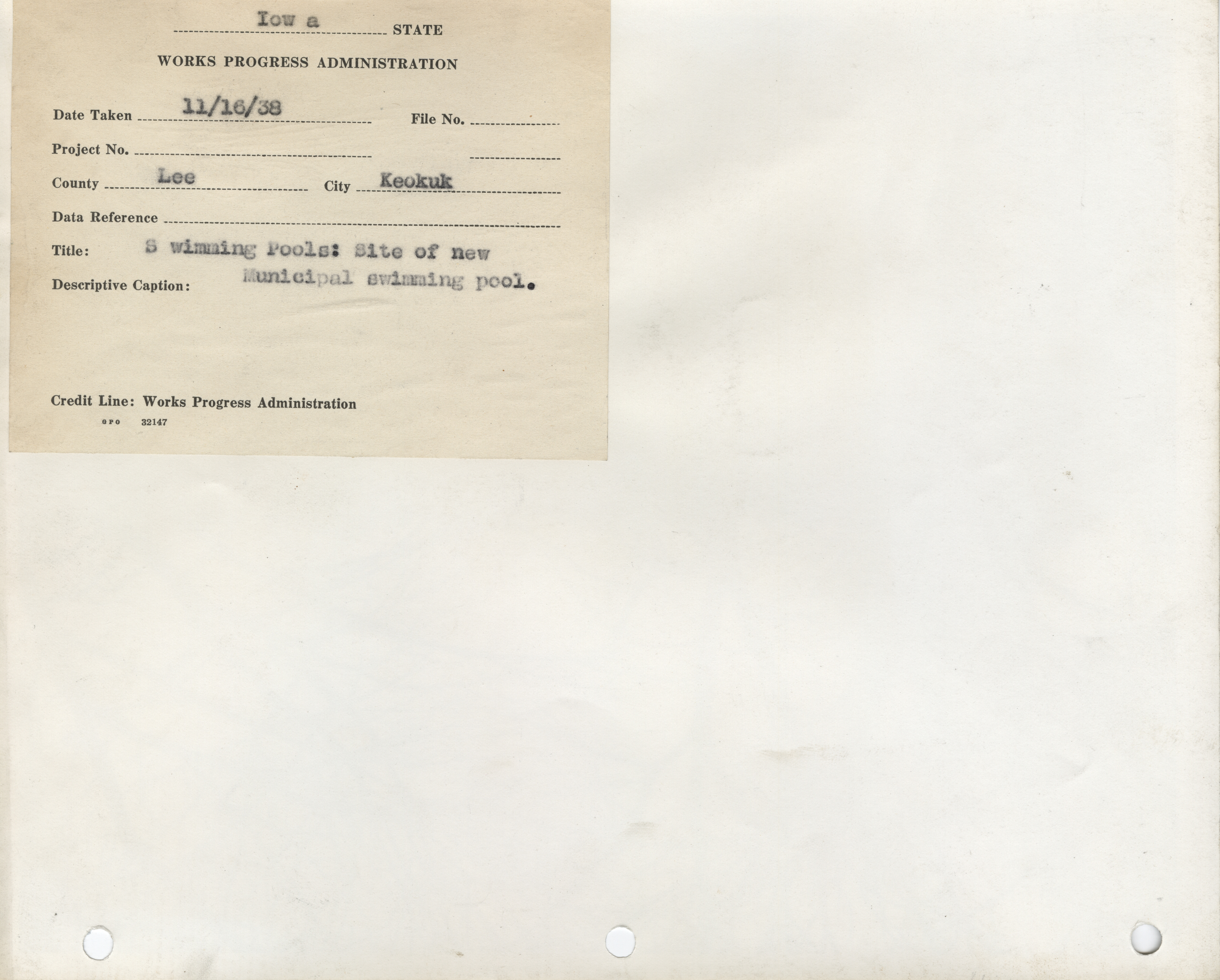 - "Photograph of the site of the new municipal swimming pool in Keokuk", Work Projects Administration (Iowa) Photographs, Iowa State University Library Digital Collections