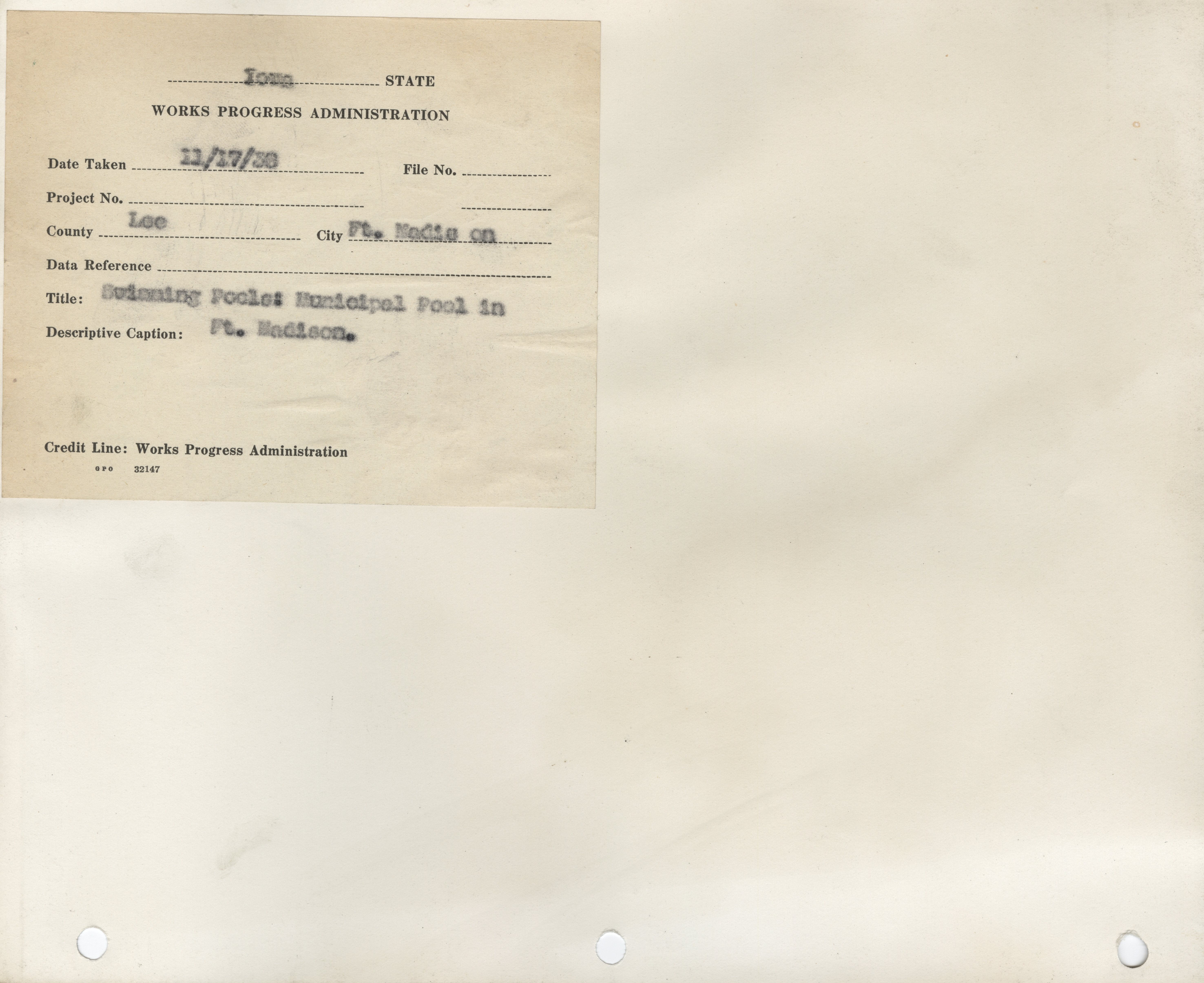 - "Photograph of the construction of municipal swimming pool in Fort Madison", Work Projects Administration (Iowa) Photographs, Iowa State University Library Digital Collections