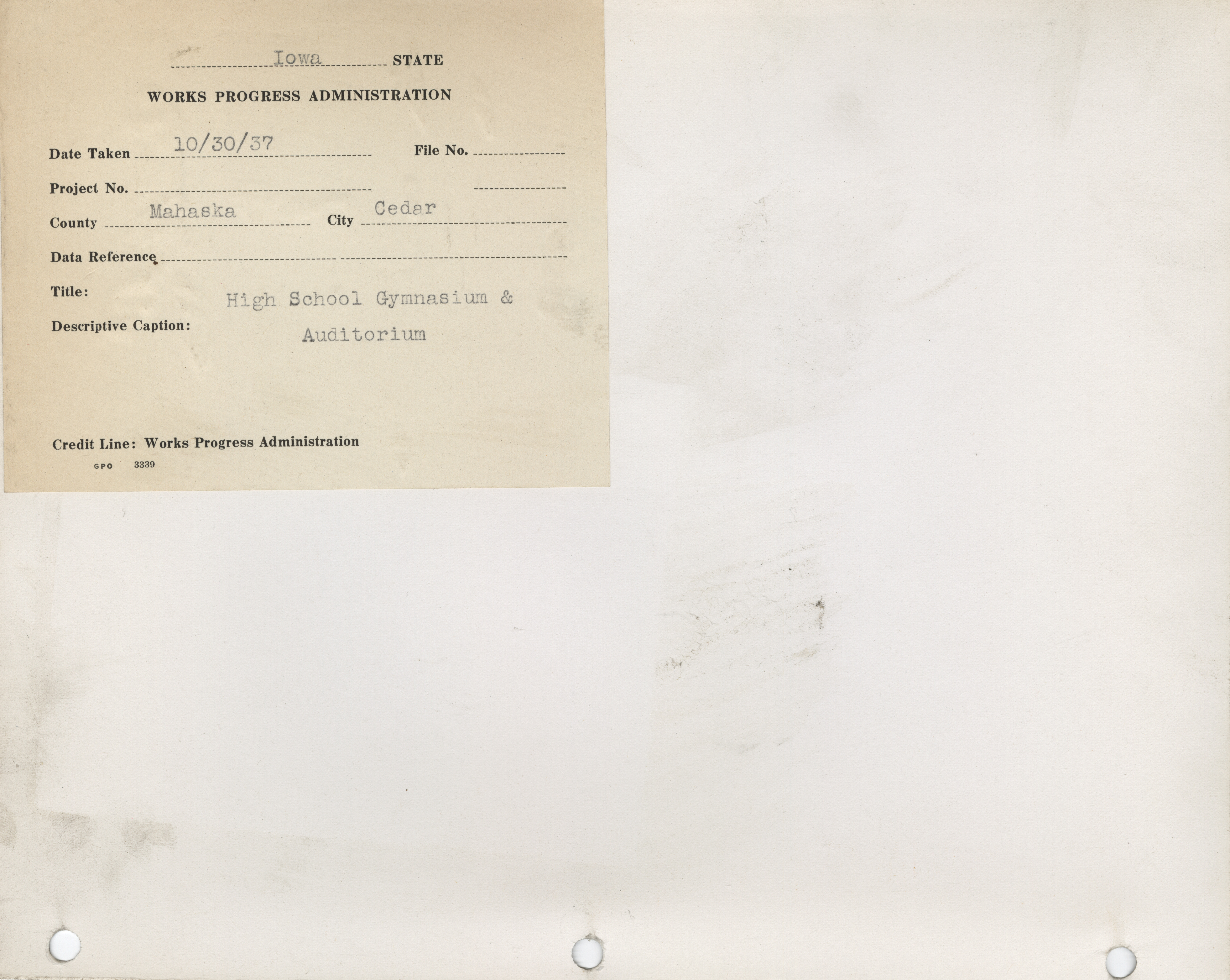 - Stadiums and Swimming Pools. Mahaska County. Cedar. High School Gymnasium and Auditorium. (1 b/w photograph), 1937