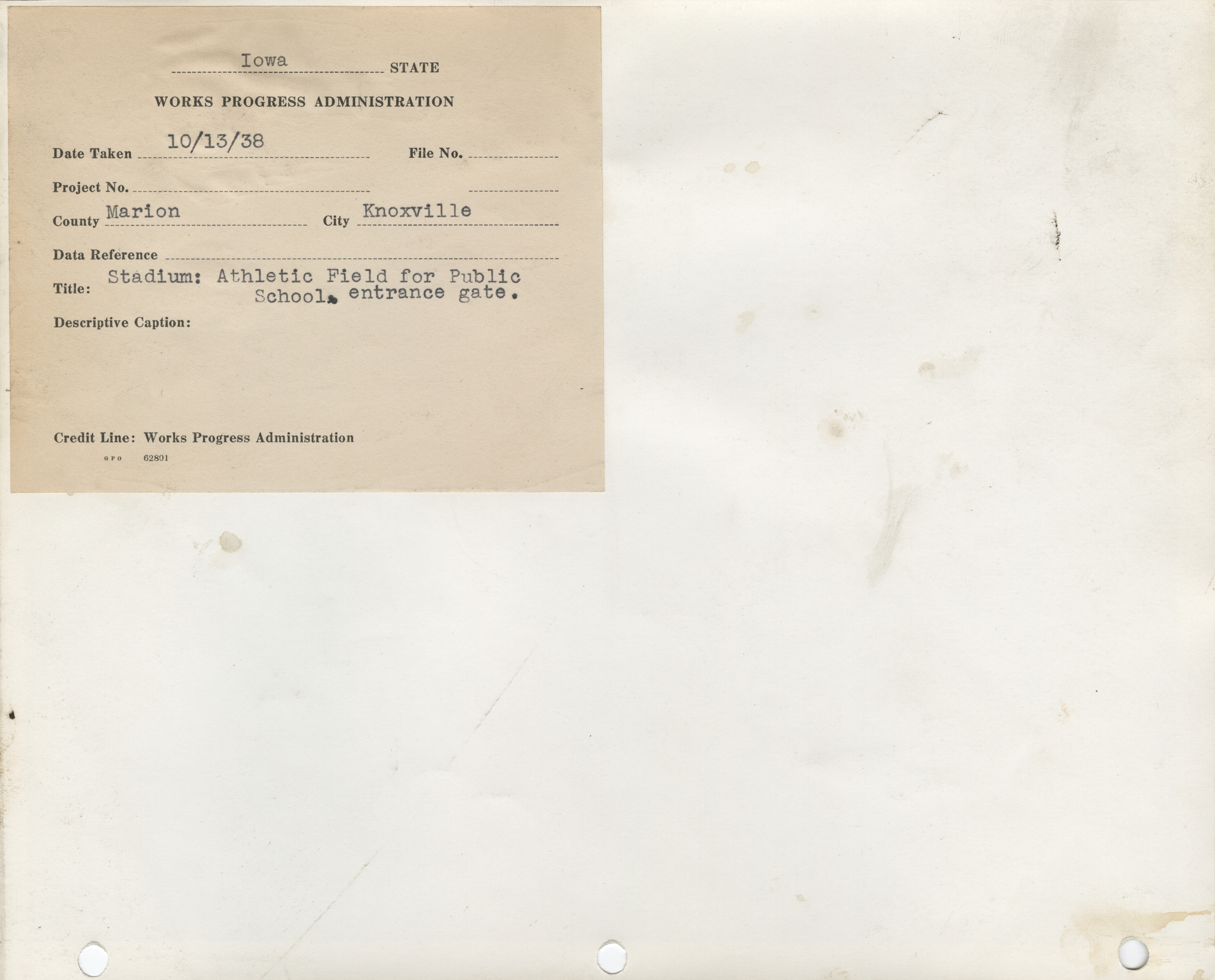 - Stadiums and Swimming Pools. Marion county. Knoxville. Entrance Gate to Athletic Field. (2 b/w photographs), 1938