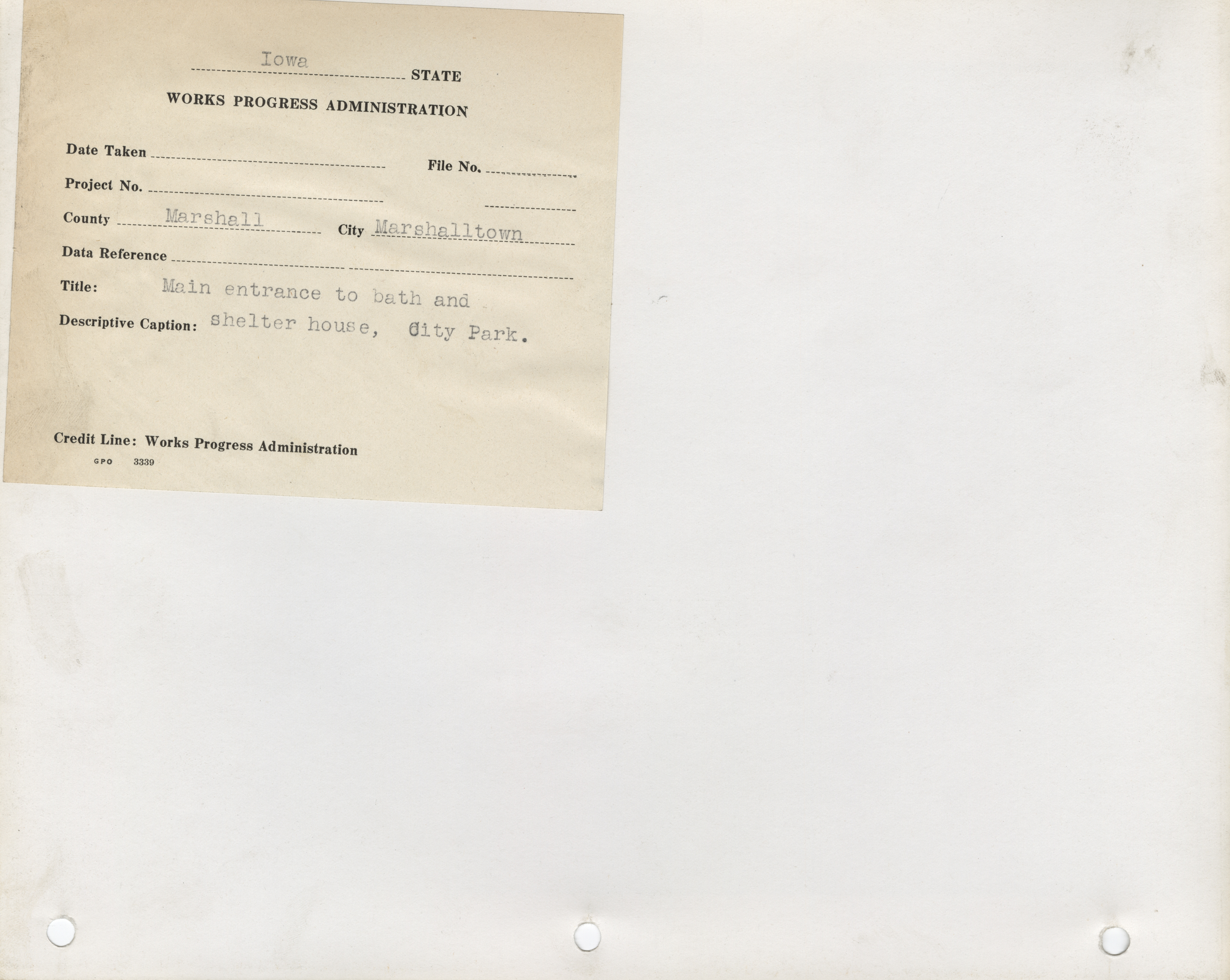 - "Photograph of the main entrance to the bath and shelter house at the city park in Marshalltown", Work Projects Administration (Iowa) Photographs, Iowa State University Library Digital Collections
