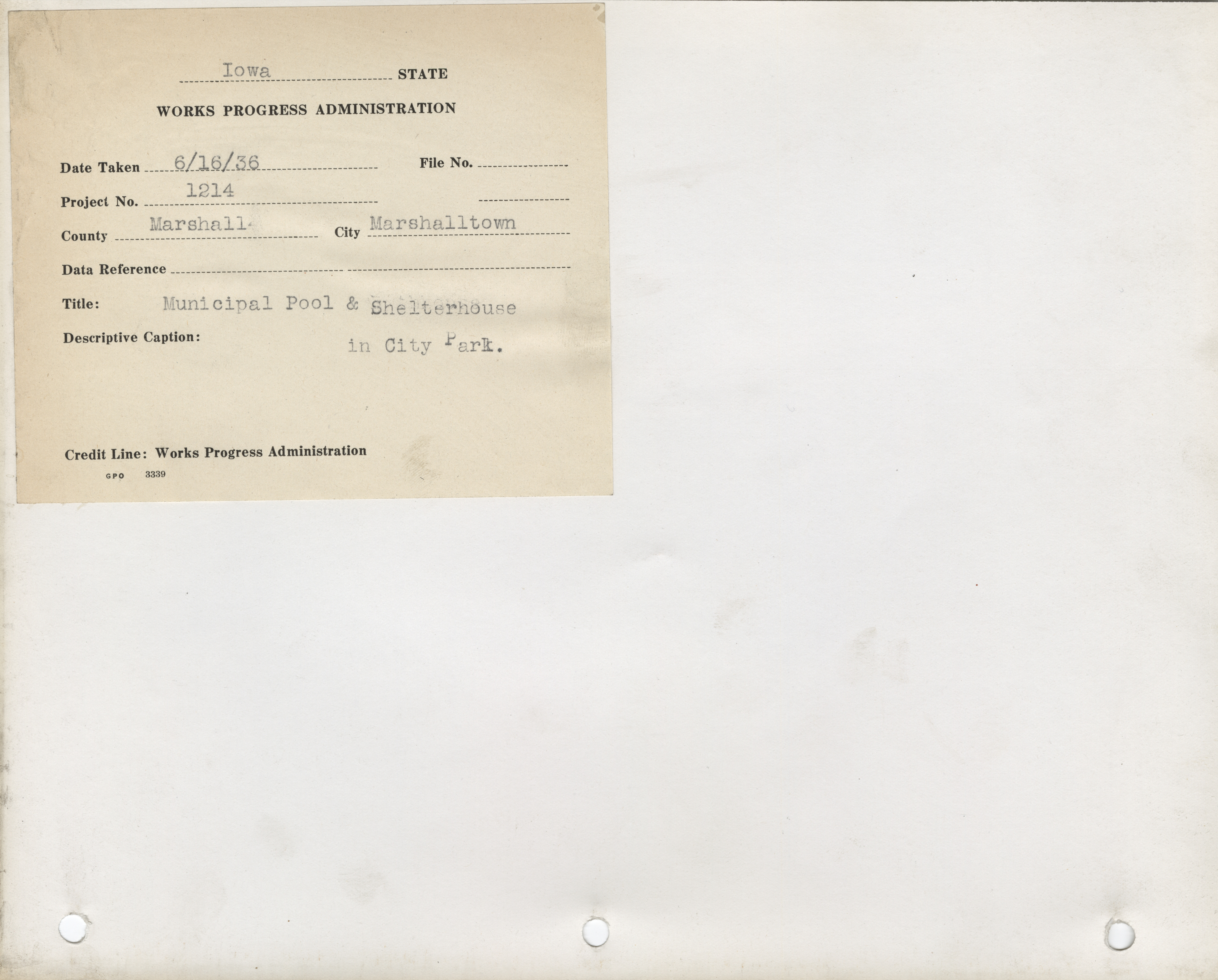 - "Photograph of the municipal swimming pool and shelter house at the city park in Marshalltown", Work Projects Administration (Iowa) Photographs, Iowa State University Library Digital Collections