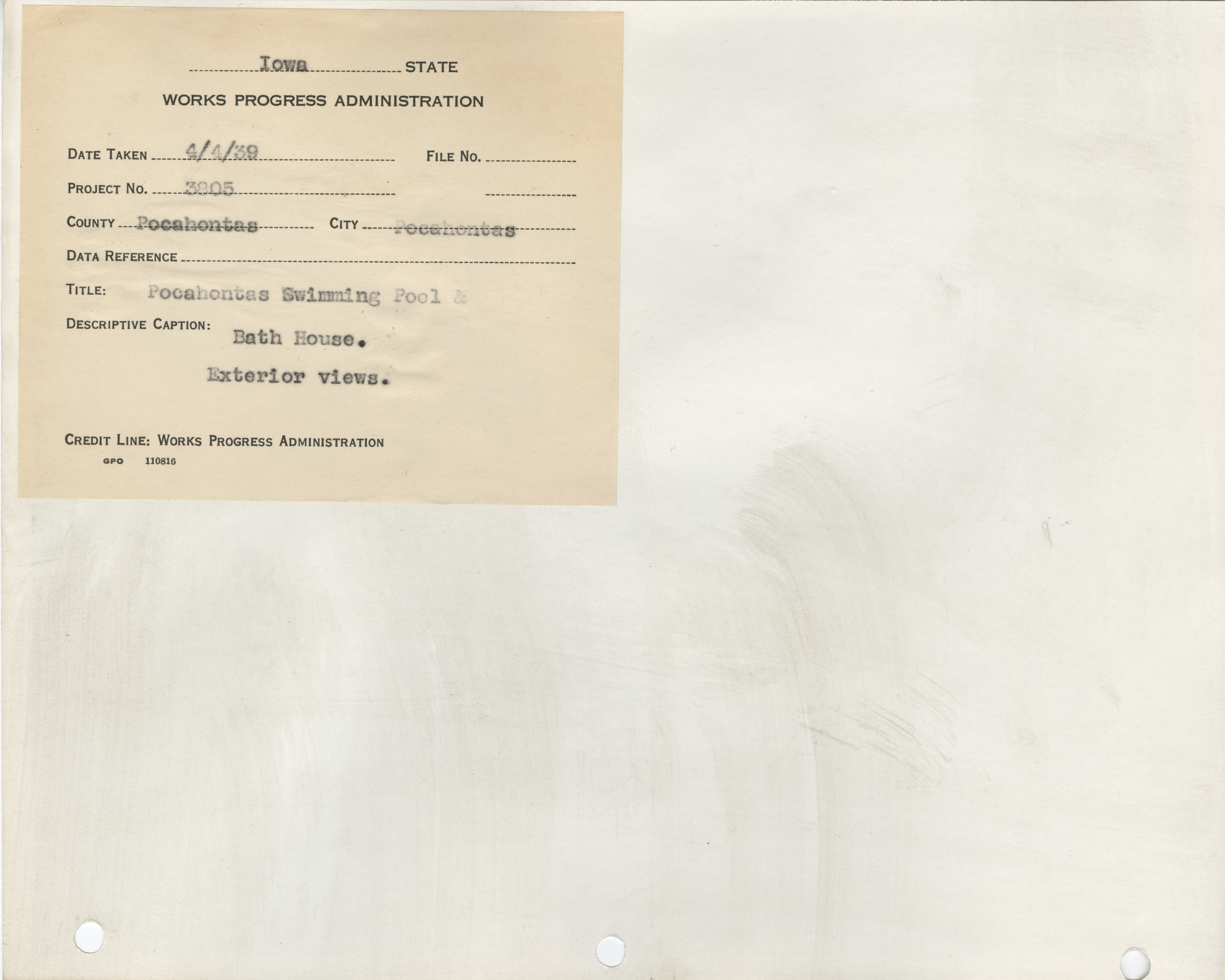 - "Photograph of the exterior view of the swimming pool and bathhouse in Pocahontas", Work Projects Administration (Iowa) Photographs, Iowa State University Library Digital Collections
