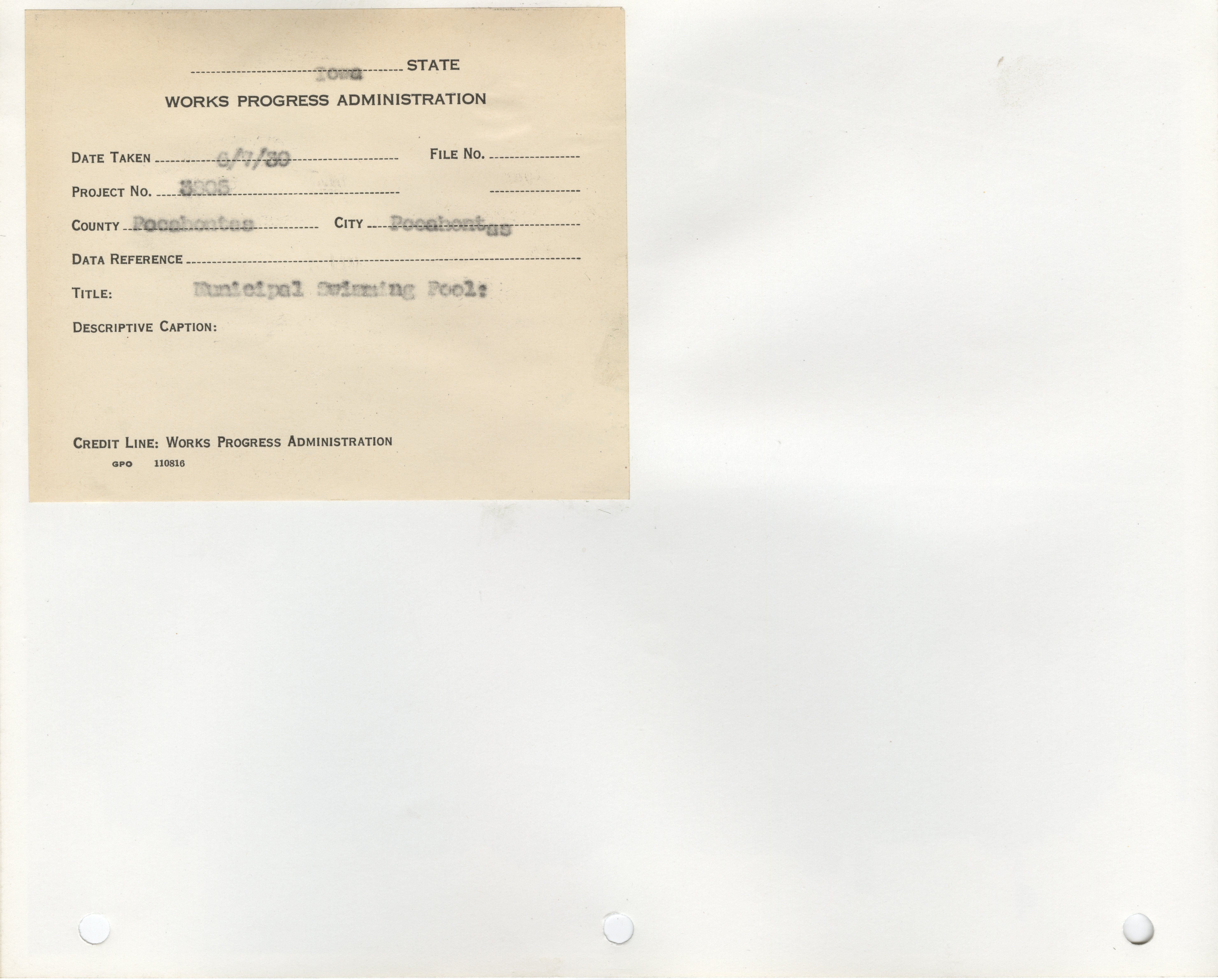- Stadiums and Swimming Pools. Pocahontas County. Pocahontas. Swimming Pool. Project 3805. (9 b/w photographs), 1939