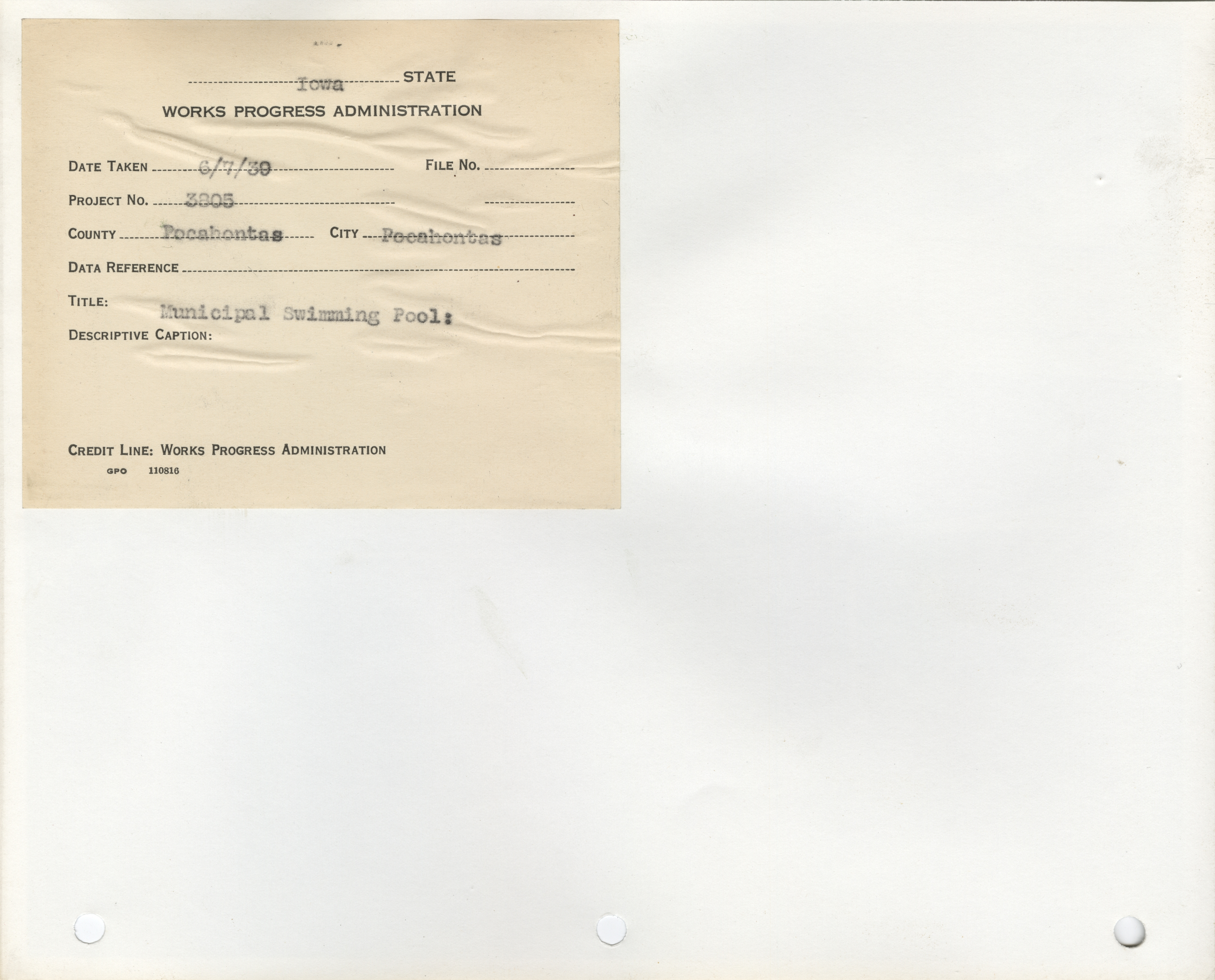 - "Photograph of people using the municipal swimming pool in Pocahontas", Work Projects Administration (Iowa) Photographs, Iowa State University Library Digital Collections