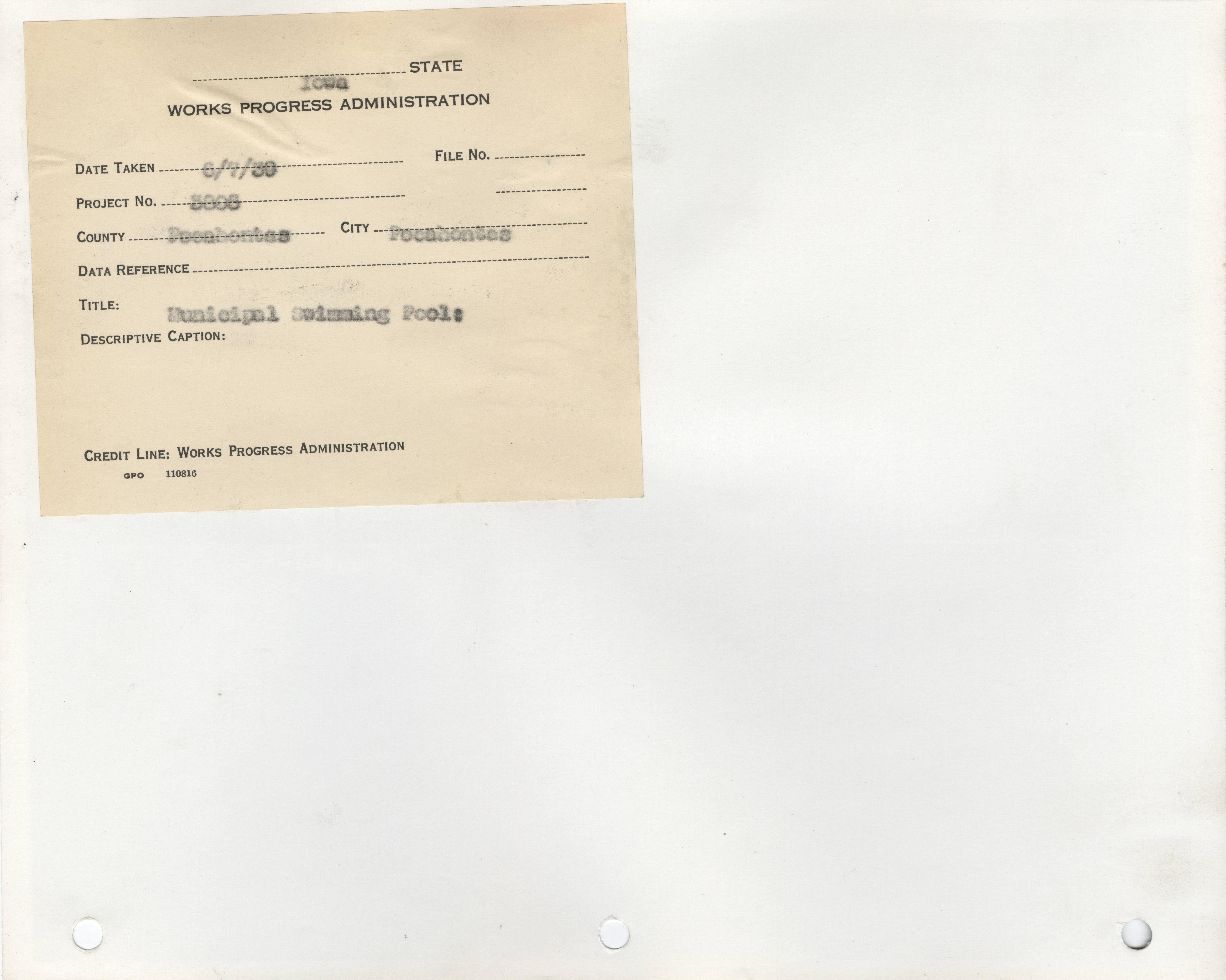 - "Photograph of people using the municipal swimming pool in Pocahontas", Work Projects Administration (Iowa) Photographs, Iowa State University Library Digital Collections