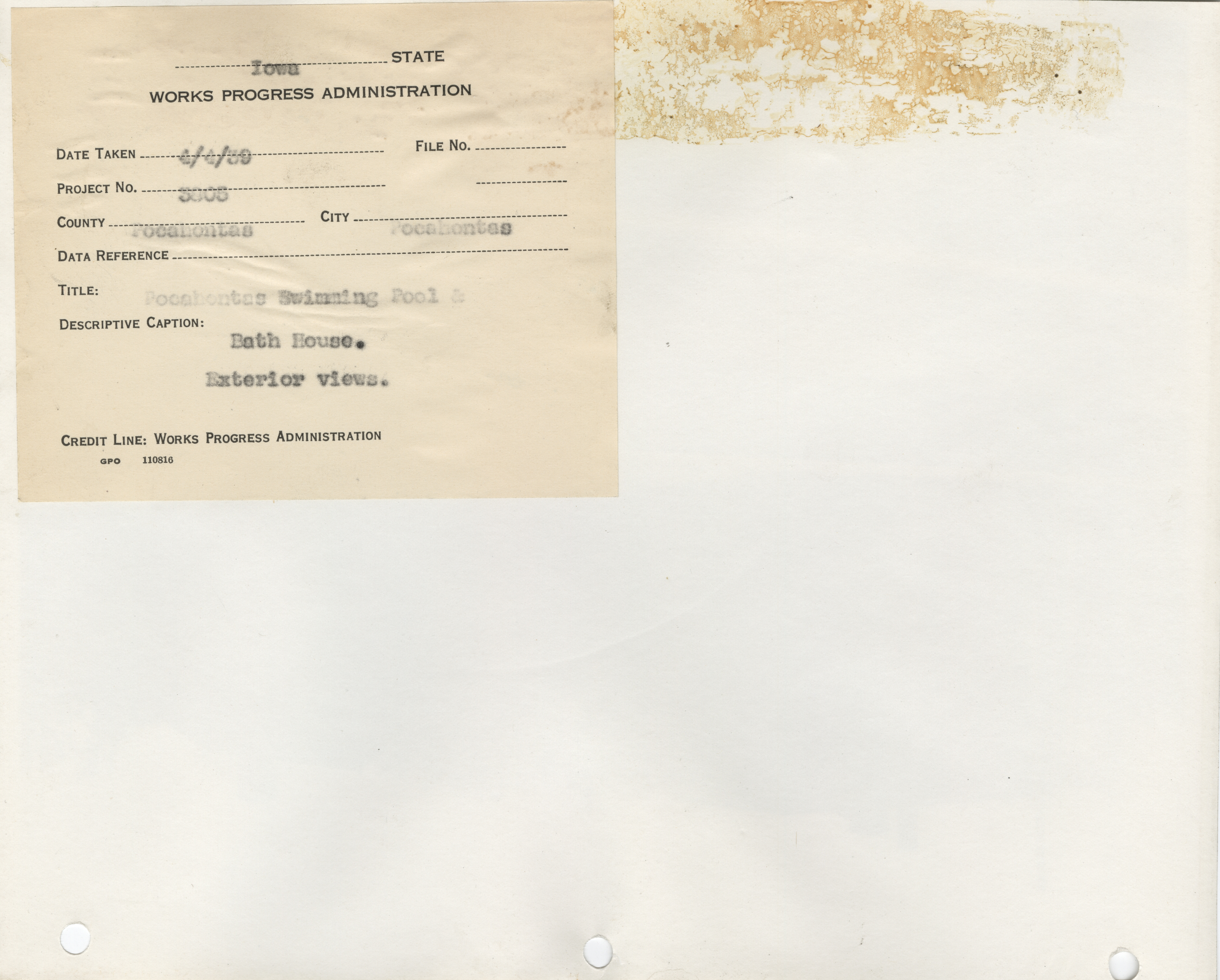 - Stadiums and Swimming Pools. Pocahontas County. Pocahontas. Swimming Pool. Project 3805. (9 b/w photographs), 1939