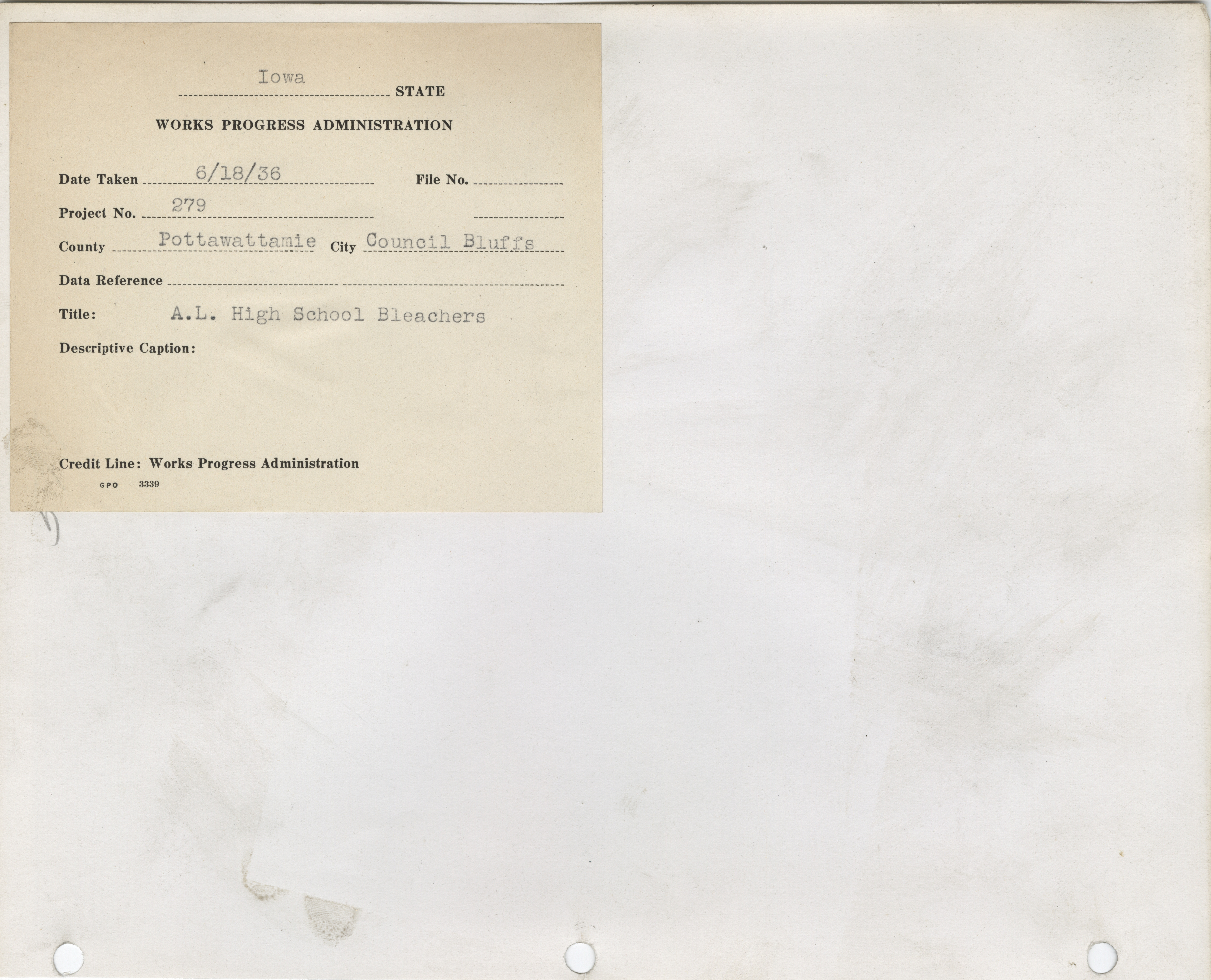 - Stadiums and Swimming Pools. Pottawattamie County. Council Bluffs. Abraham Lincoln High School Bleachers. Project 279. (1 b/w photograph) 1936, 1936
