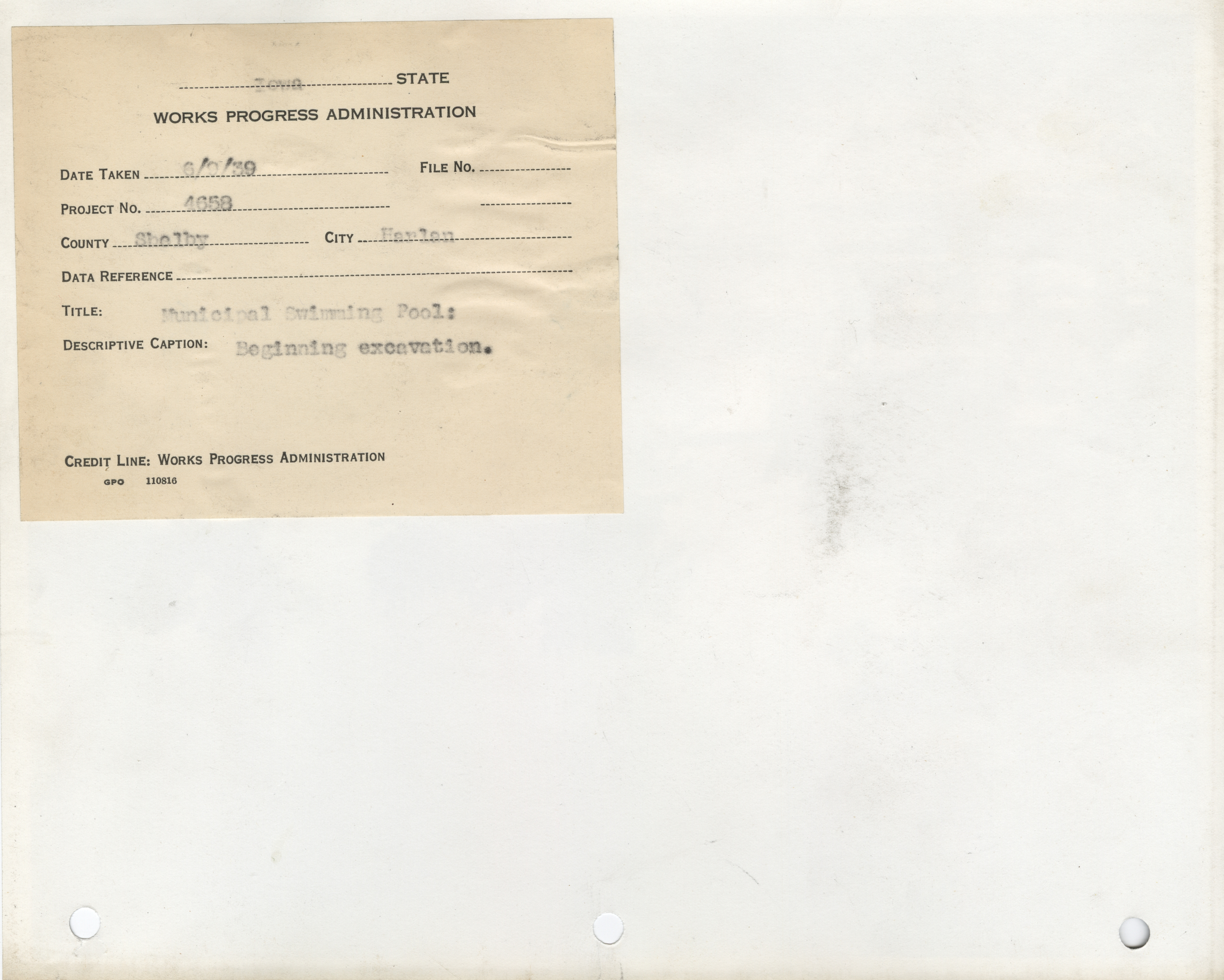 - Stadiums and Swimming Pools. Shelby County. Harlan. Swimming Pool, Beginning Excavation. Project 4658. (1 b/w photograph), 1939