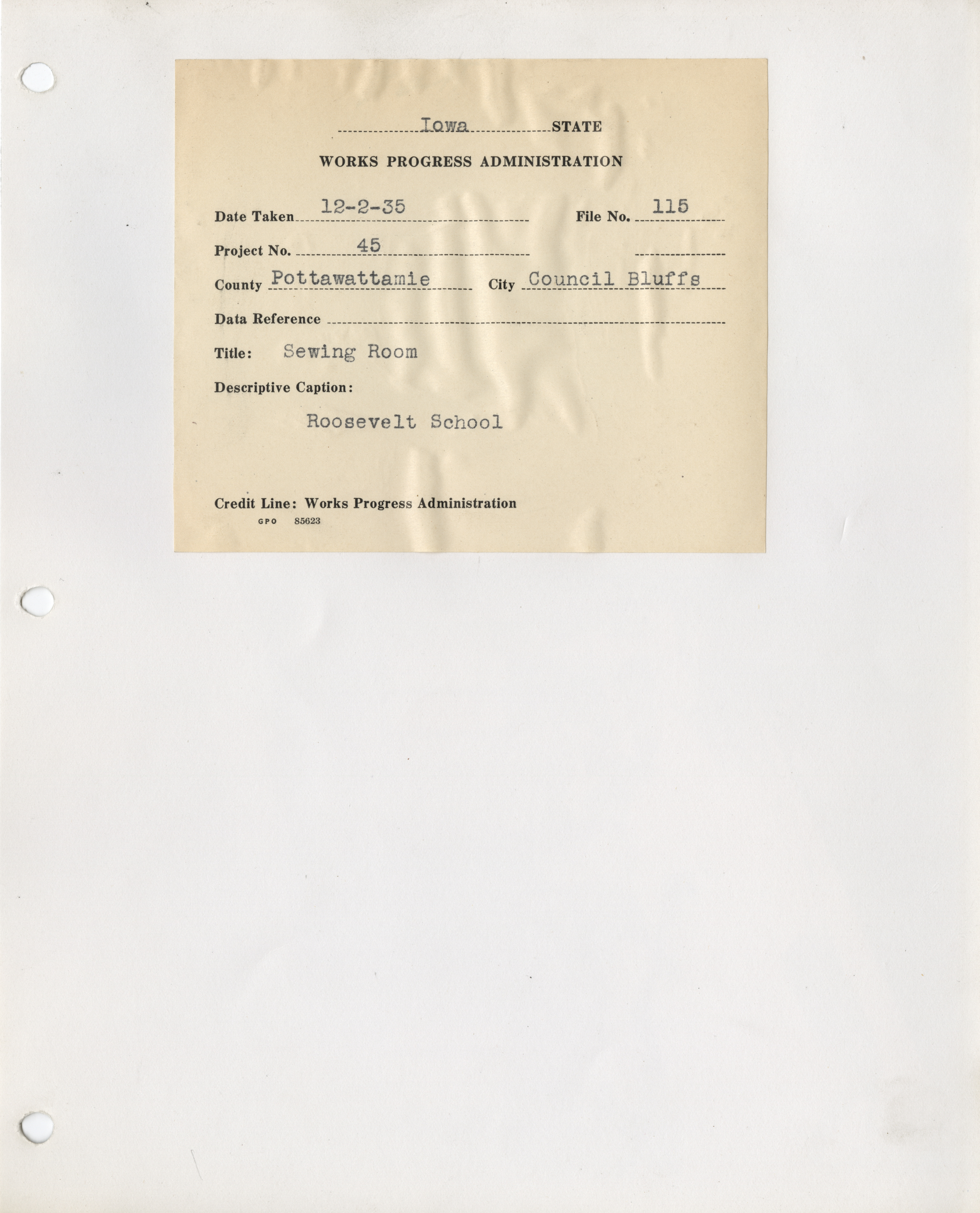 - "Photograph of women sewing in the sewing room of the Roosevelt School in Council Bluffs", Work Projects Administration (Iowa) Photographs, Iowa State University Library Digital Collections