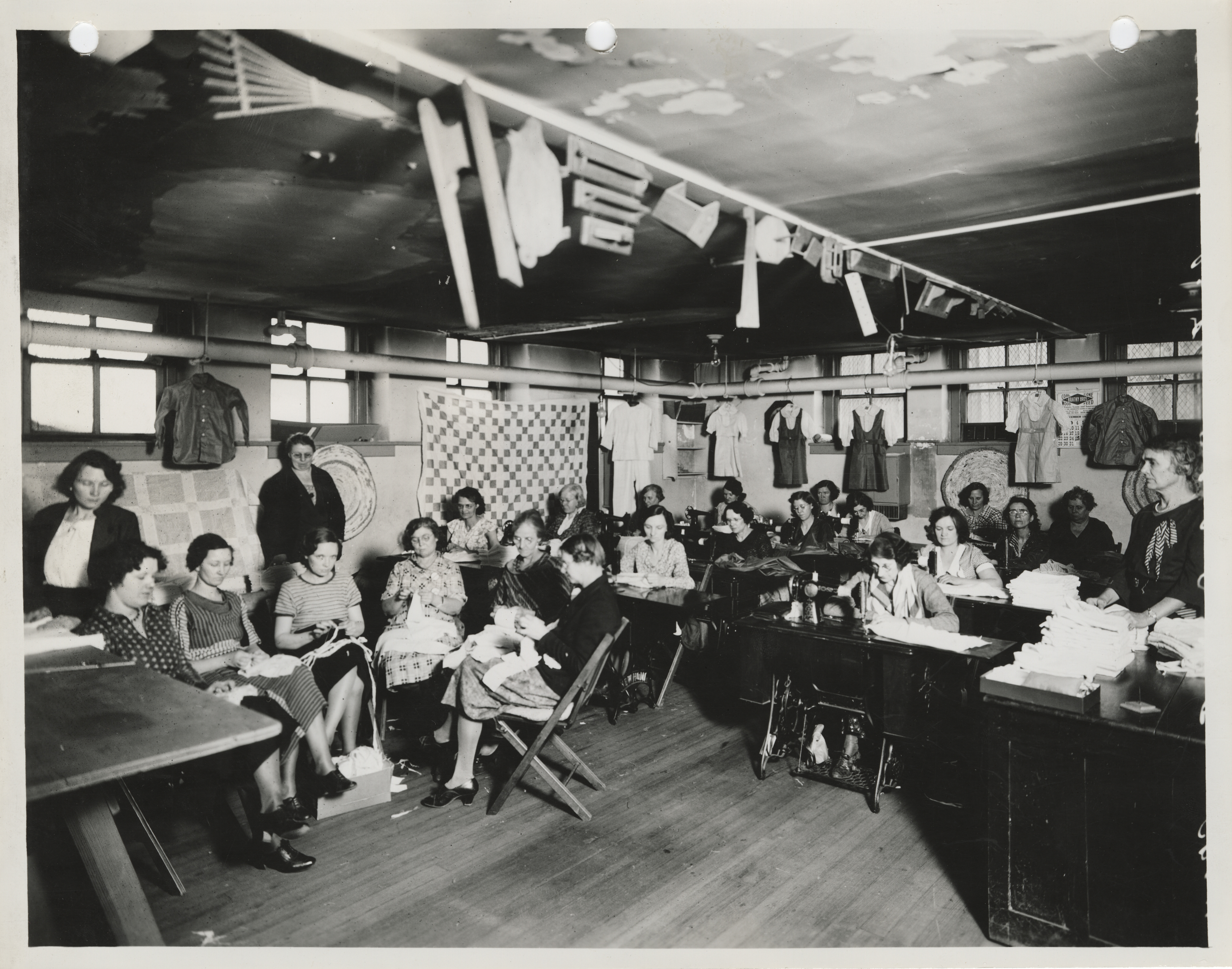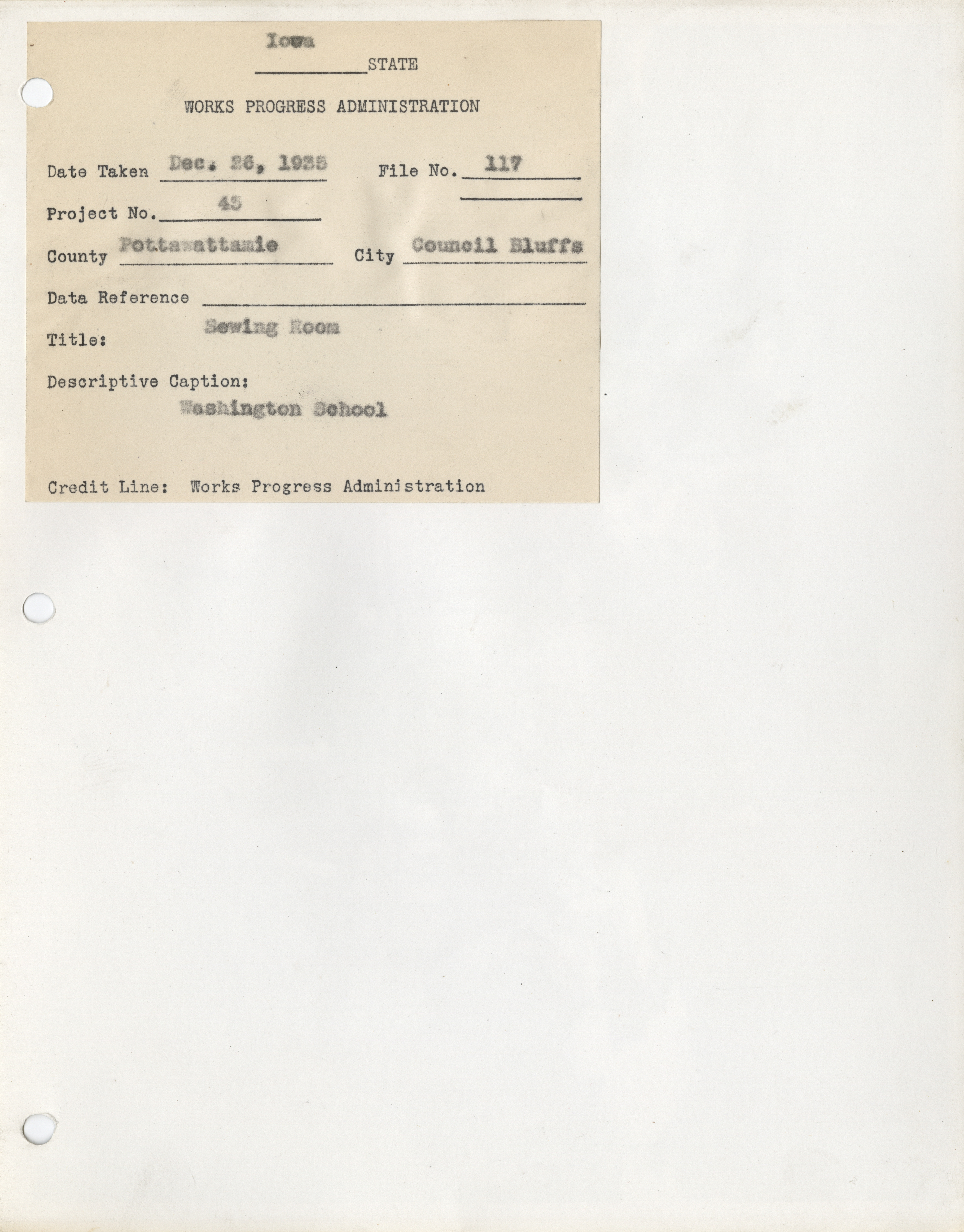 - "Photograph of women sewing in the sewing room of the Washington School in Council Bluffs", Work Projects Administration (Iowa) Photographs, Iowa State University Library Digital Collections